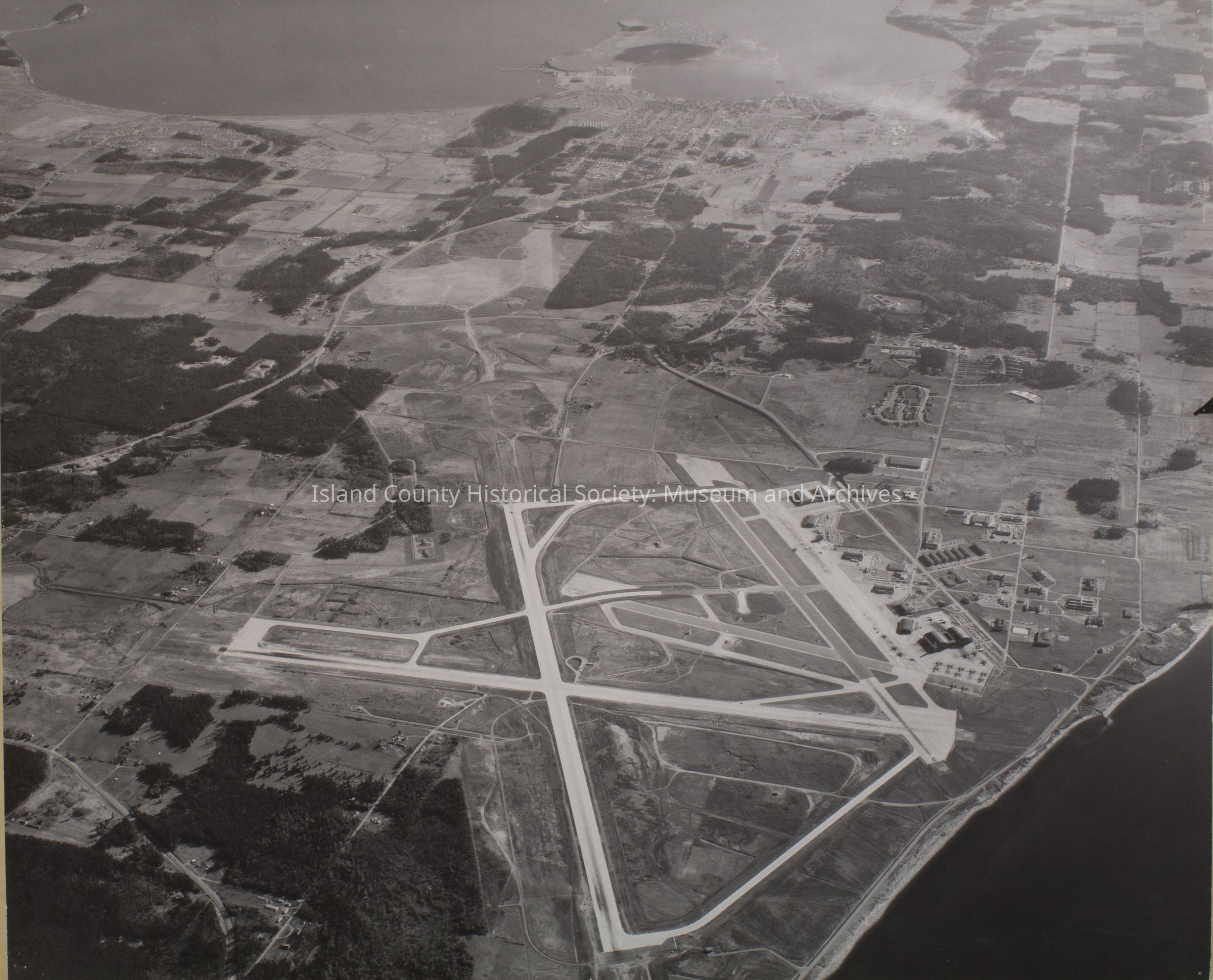 Aeial photo of NAS Whidbey Island, Ault Field, looking south towards the main part of Oak Harbor, Maylor Point. From a sticky note: New 8000'runway delineated and superimposed on aerial photo by Hal West, May 1960.Made/Created