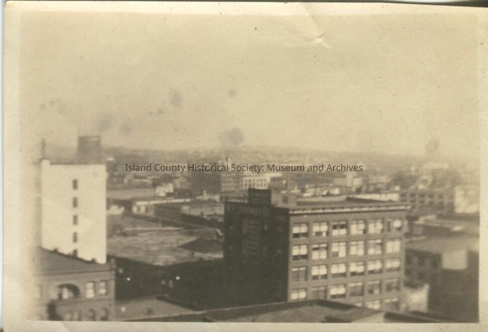 Black & white photo of a city view of buildings. No description or date.