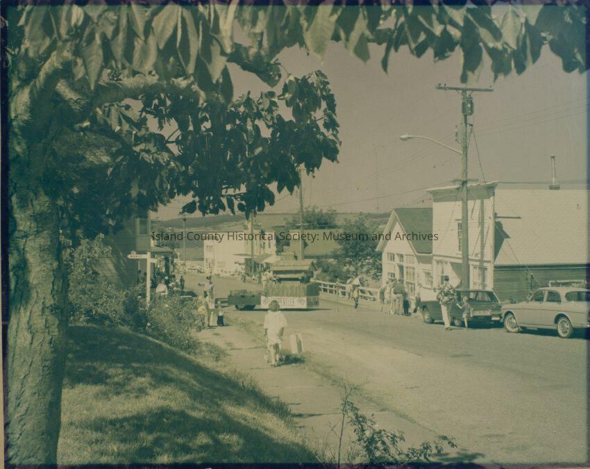 Photo of Coupeville, Front Street, probably setting up for an event. The photo is taken from the front of Haller House looking west down Front Street. A float with a blockhouse is at the corner of Front and Main Street with a policeman directing traffic. The float has 1855-1965 Coupeville High School. People and cars are scattered about. a