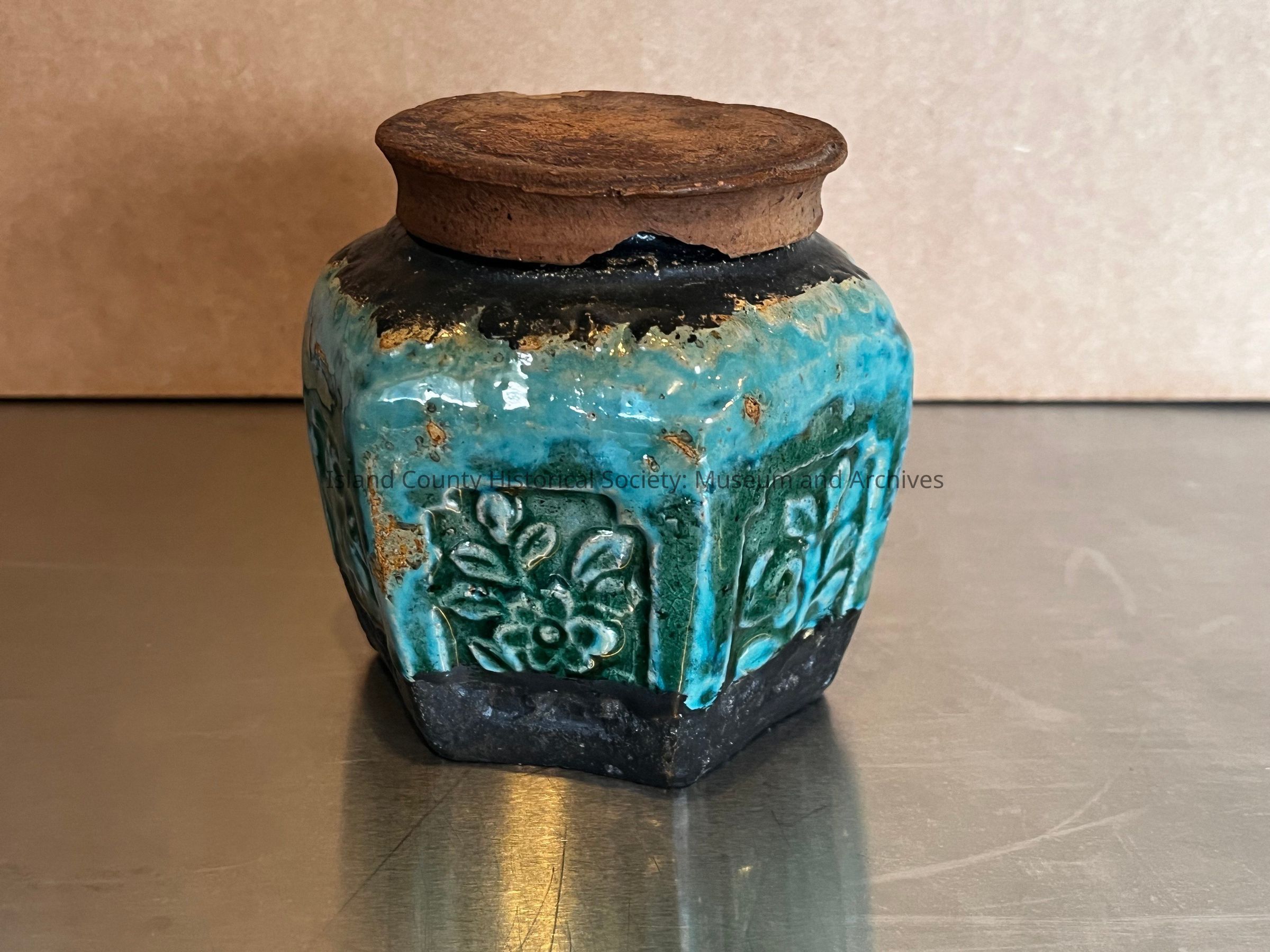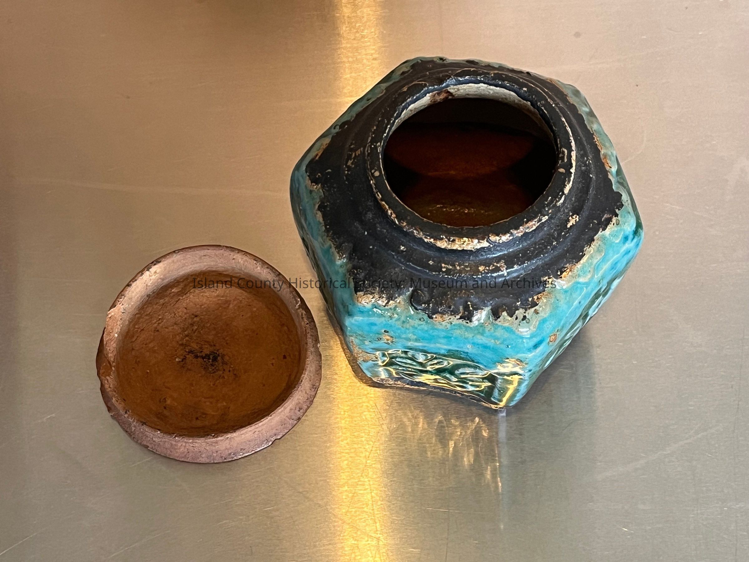 Ginger jar with lid. Aquamarine coloring with black top and bottom. Chinese immigrants