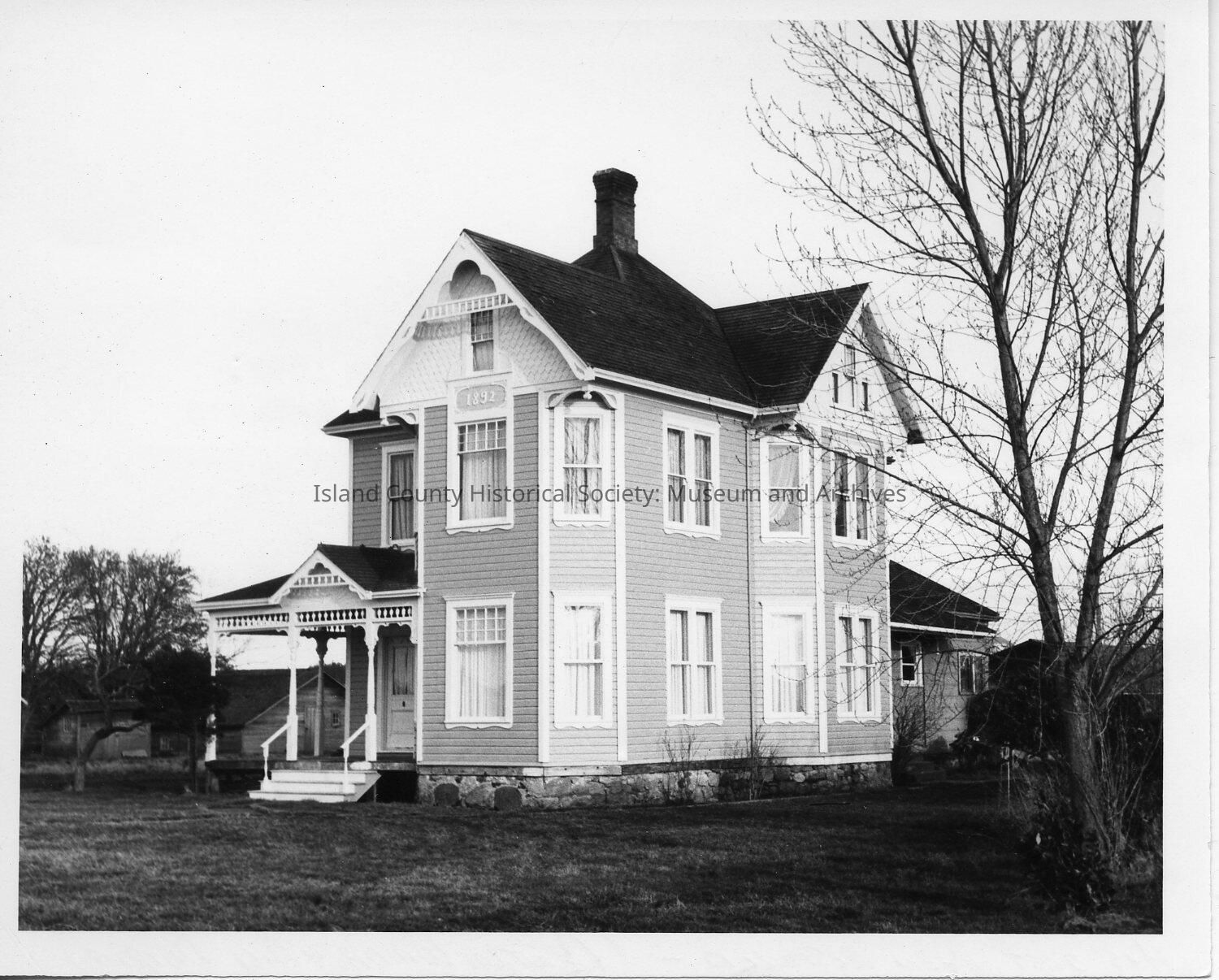 1892 Francis LeSourd House on Ebey's Prairie. As seen from southwest, it is 2 1/2 stories with many windows and gingerbread at roof and porch. One chimney rises from center. Built by Harold Lovejoy. When picture was taken in 1971, it had recently been restored.