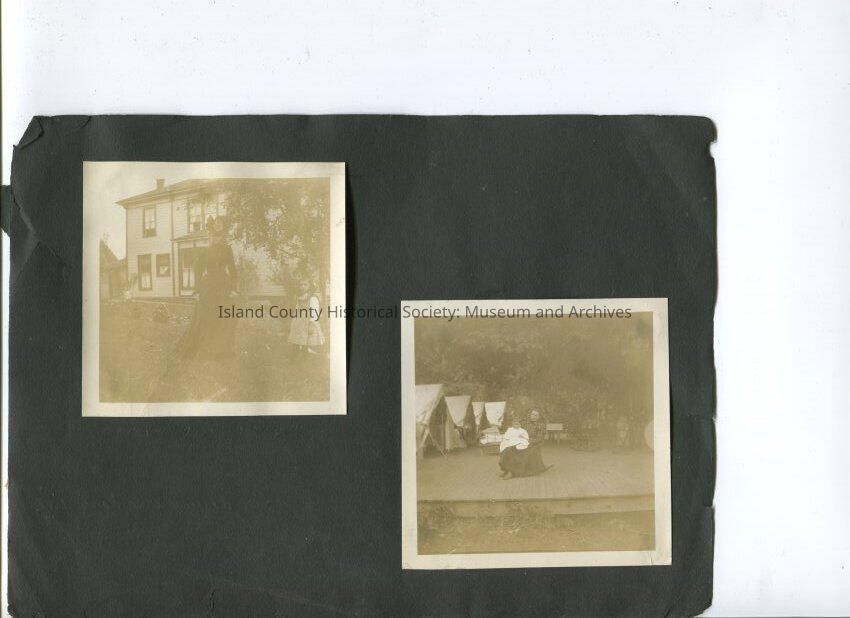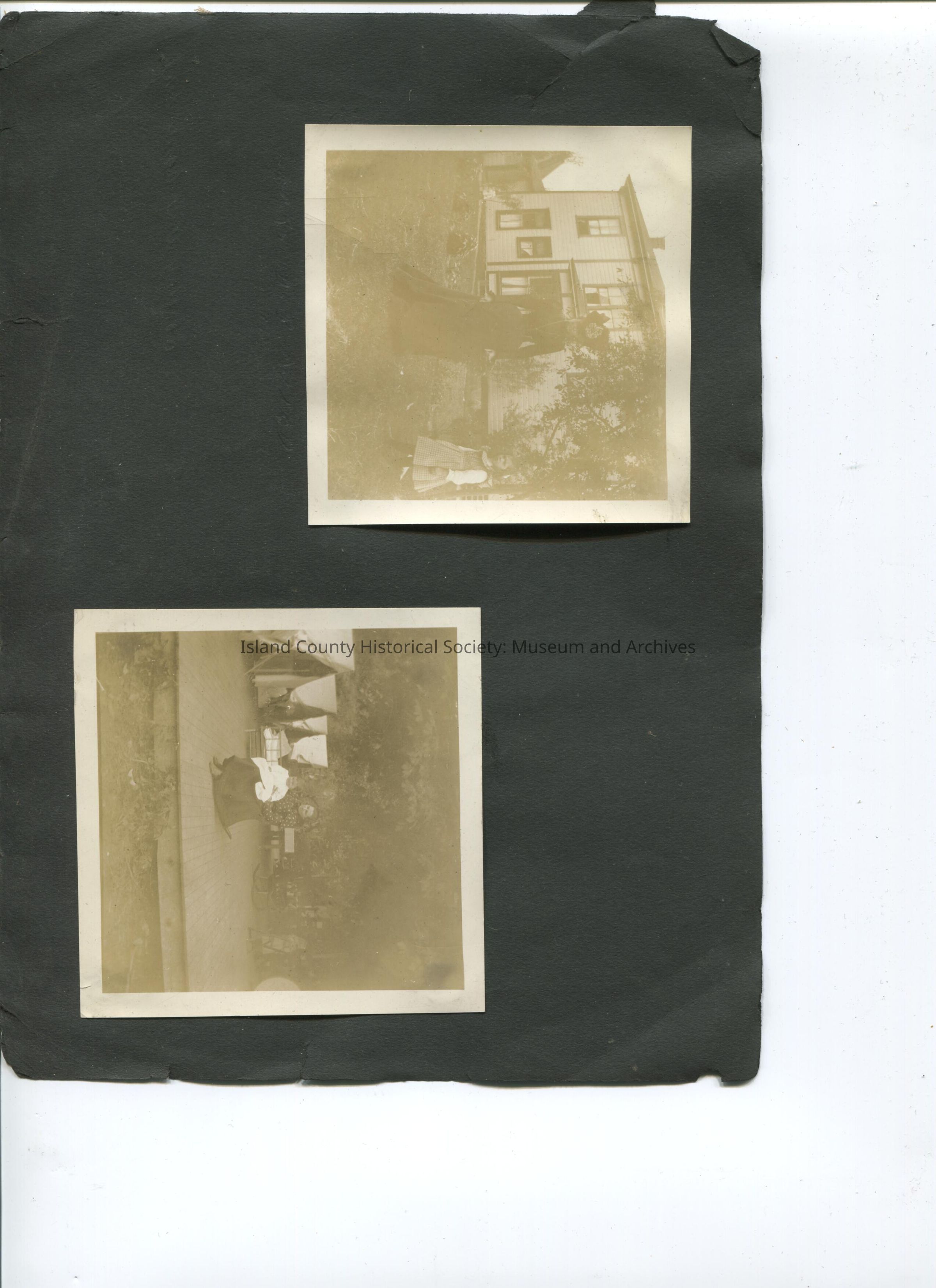 Page 1 Top Left- Photo of a woman and small girl standing in front of a two story house. The woman is wearing a long sleeved, dark colored, floor length dress and a large hat with a bow. The girl is wearing a long sleeved blouse under a checked jumper. Handwritten on the black album paper under the photo, "Mrs. D. B. Ward." Photo size - 3.75"W x 3.75"H.