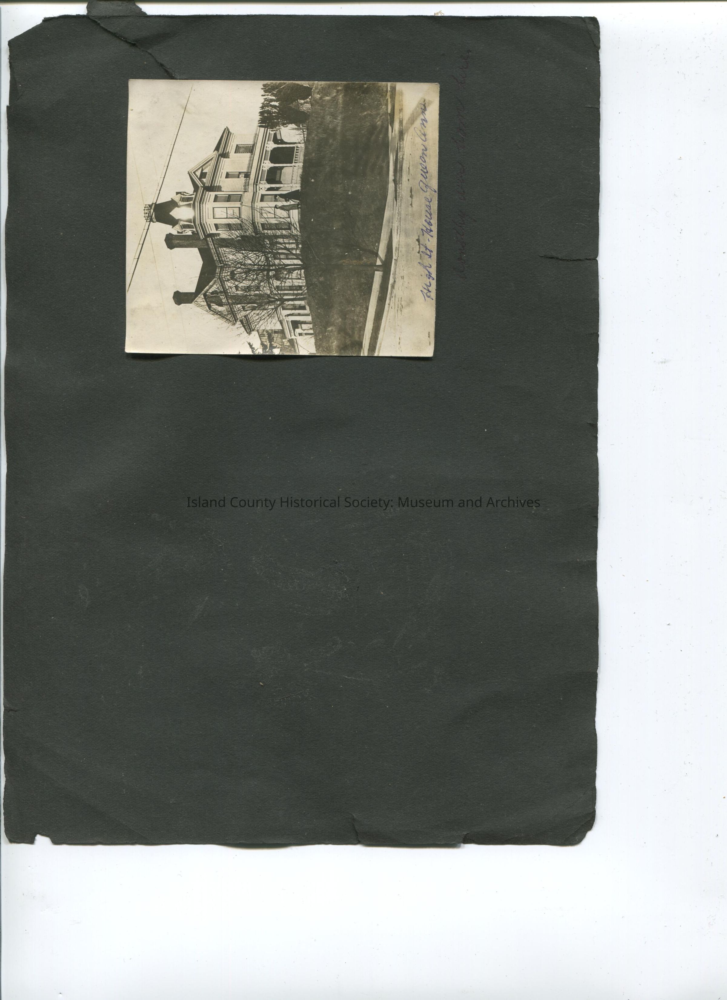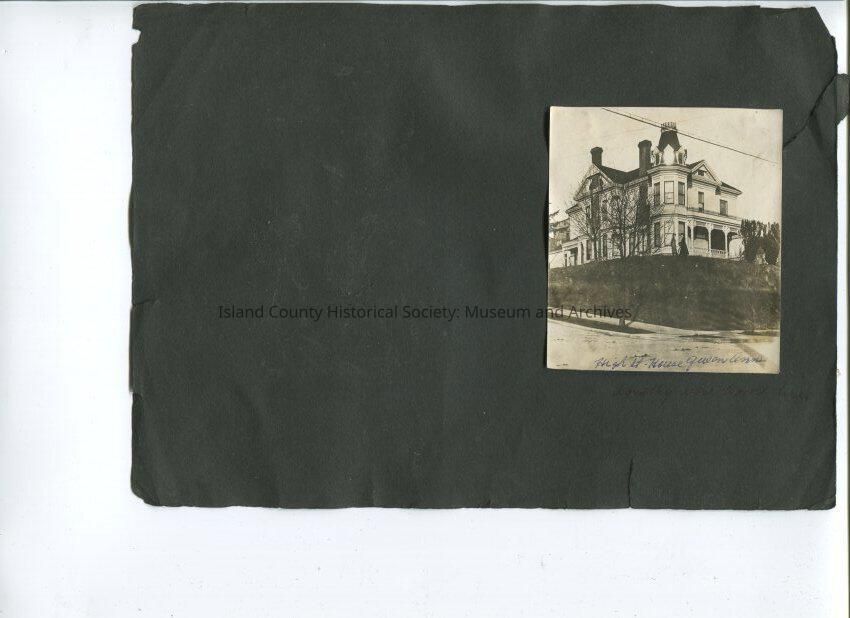 Page 2 Right - Photo of a large 3-story Victorian house sitting on a hill with two brick chimneys and a turret structure on one corner. The house is on a corner lot that is high above the street. The house has Two women in long coats are standing in front of the house. Handwritten at the bottom of the photo, "High St. House Queen Ann. Photo size - 3.25"W x 3.5"H.Made/Created