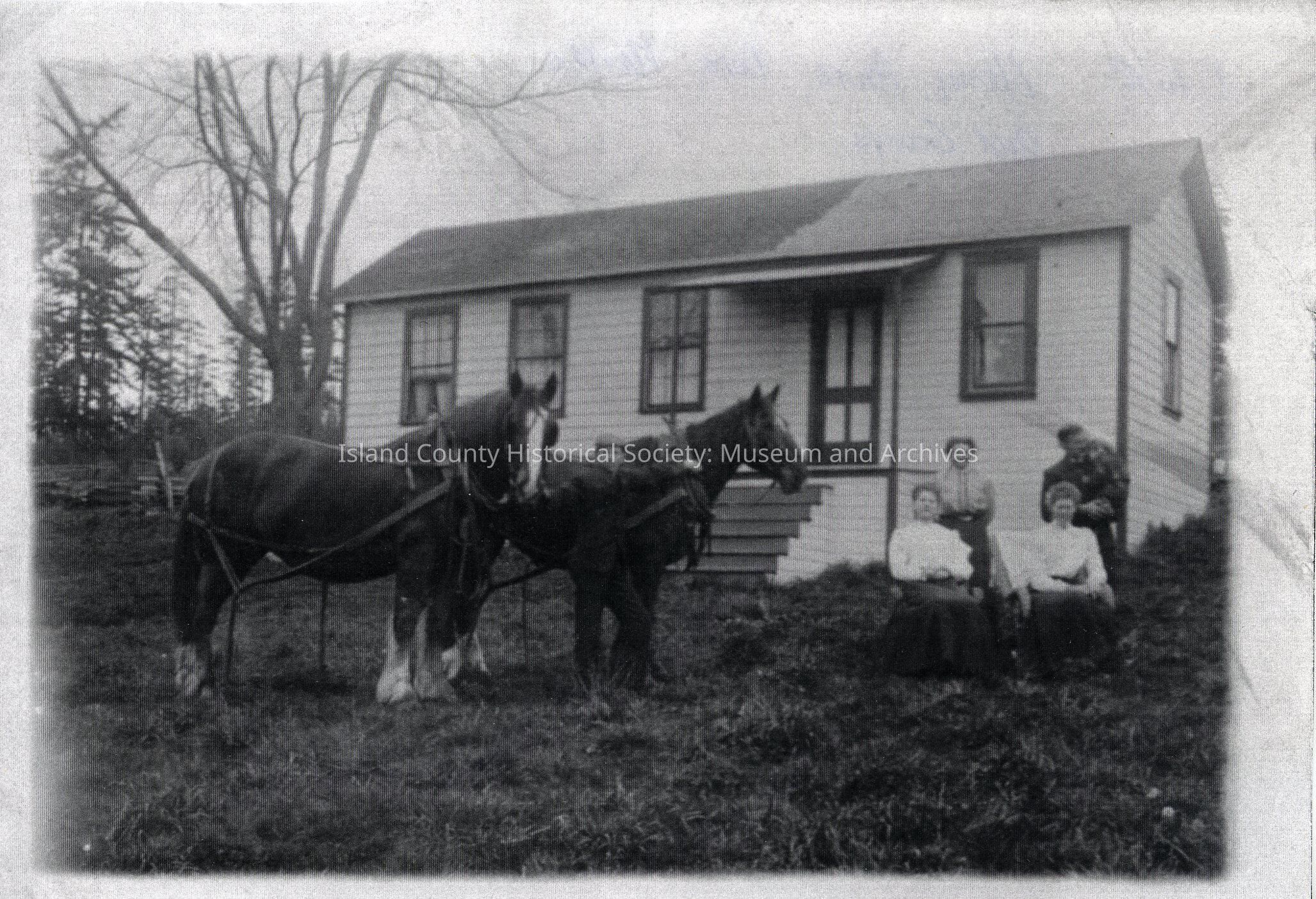Black & white photocopy of three women and a man holding a child. They are standing/sitting in front of the right side of a house. Two work horses are standing in the left side of the picture. The one story ranch house is painted white with dark trim. It has four windows across the front, and a covered porch over the front door. No date.
