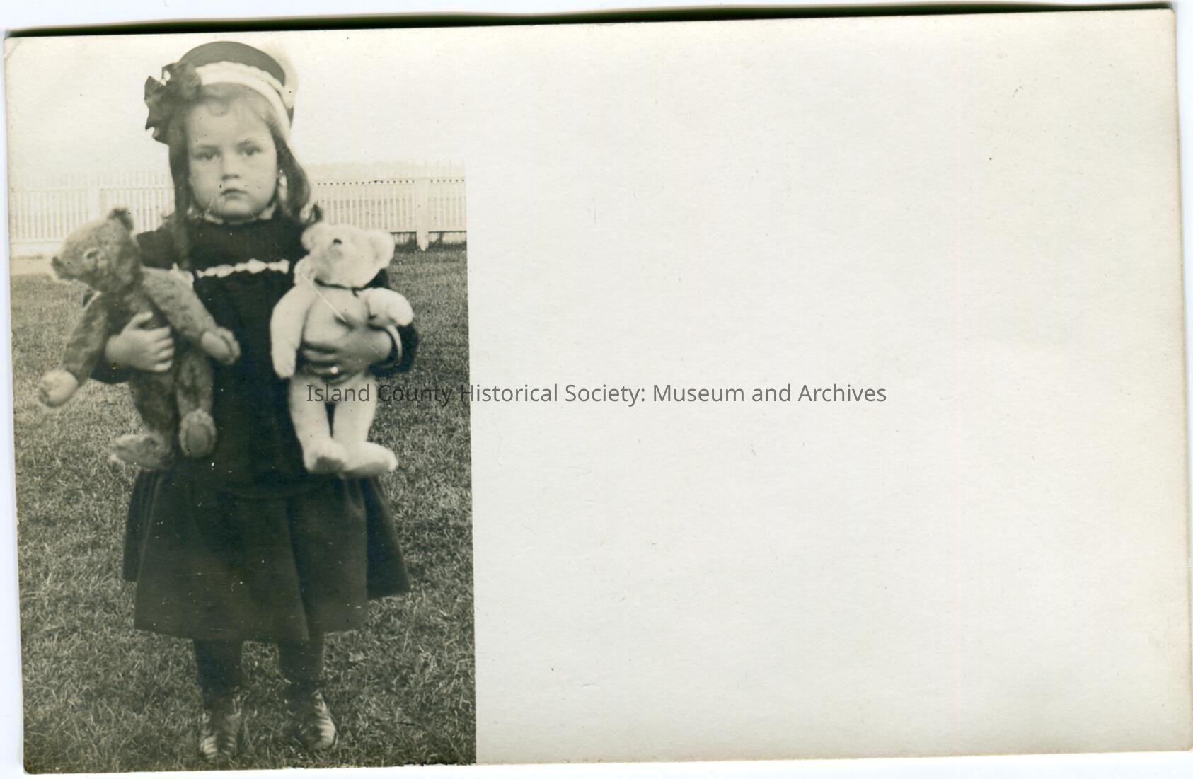 Photo of a little girl standing in the grass. She is wearing a dress with a light ribbon on the front, a hat with a bow, tights and shoes. She is holding a soft toy - teddy bears - in each arm. There is a picket fence in the background. The photo part of the postcard is on the far third of the postcard. The rest is blank. CYKO postcard issued: 1904-1920s.