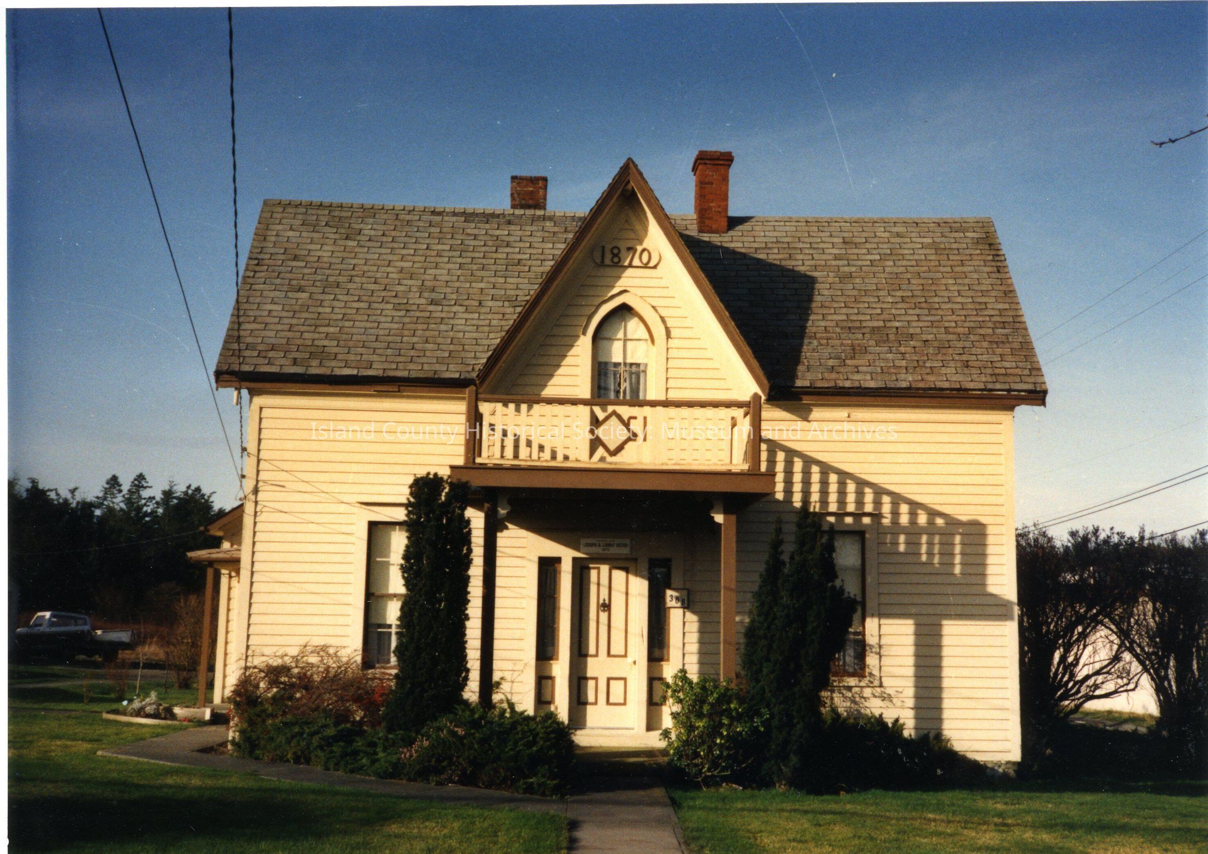 Joseph Libbey (Libby) house built by John Alexander, Jr. in 1870 and purchased by Libbey in 1877. House sits on Main St. in Coupeville. 1 1/2 stories with front door in center flanked by two windows. Porch above front door with decorative rail in front of curved door and "1870" plaque. Two chimneys. Original decorative trim at roofline has been removed.