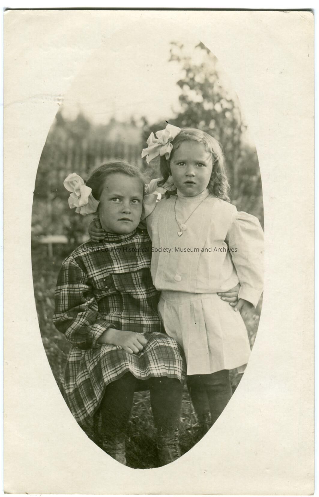 Photo of two girls. One is sitting with her left arm around the other girl standing beside her. The sitting girl is wearing a plaid dress, tights and lace shoes. The standing girl is wearing a light dress with a heart pendant necklace. Both have light bows in their hair. A fence, trees and houses are blurred in the background. On the back: "Ellen and Shelma GIllespie" AZO postcard issued: 1904-1918.