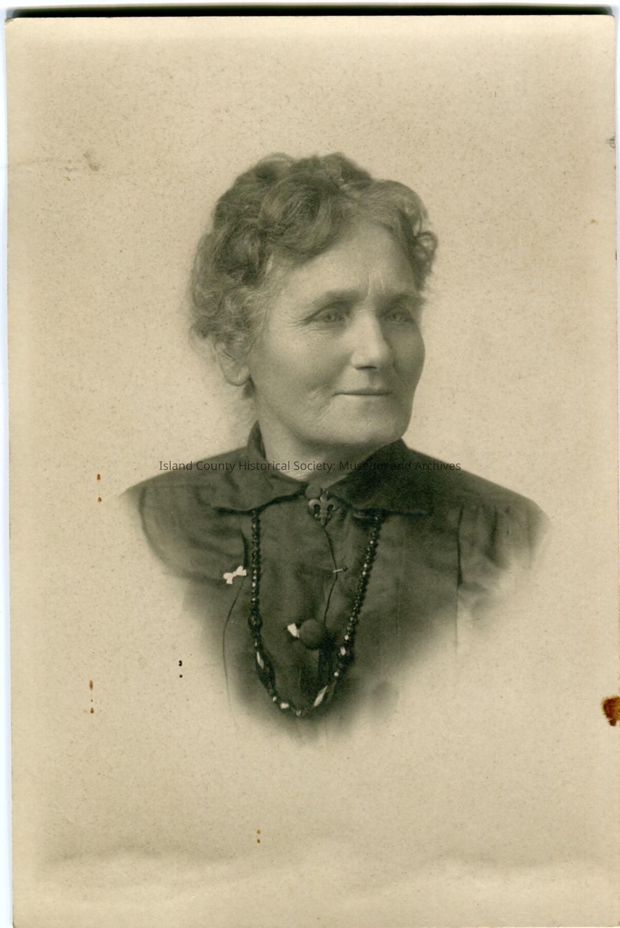 Photo portrait of an older woman. She is looking towards her left, searing a blouse and beaded necklace. She has light curly hair. A fleur-de-lis is beside the top button of her blouse or dress.