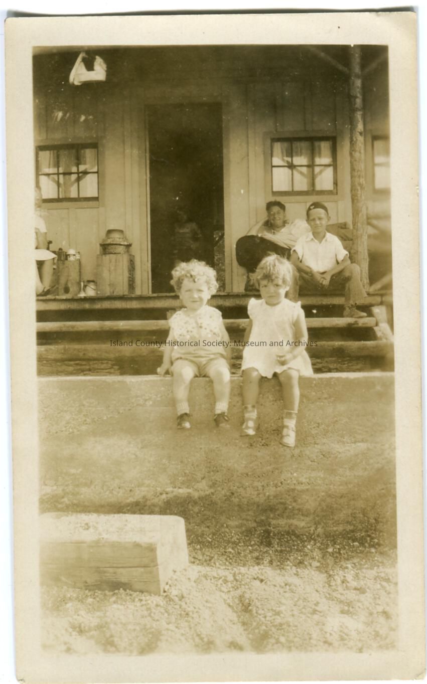 Photo of a young girl, younger boy, boy and teen or young man. The two youngest children are sitting on a concrete wall in front of a house or cabin; she is wearing a romper, anklets and strap shoes; he is wearing a similar outfit but lace shoes. The boy is sitting on the top steps and the teen or young man in a chair on the porch. They are in dark trousers and shirts. The boy is wearing a cap. The door is open and someone is just visible inside. A crate and other objects are on the porch.Made/Created
