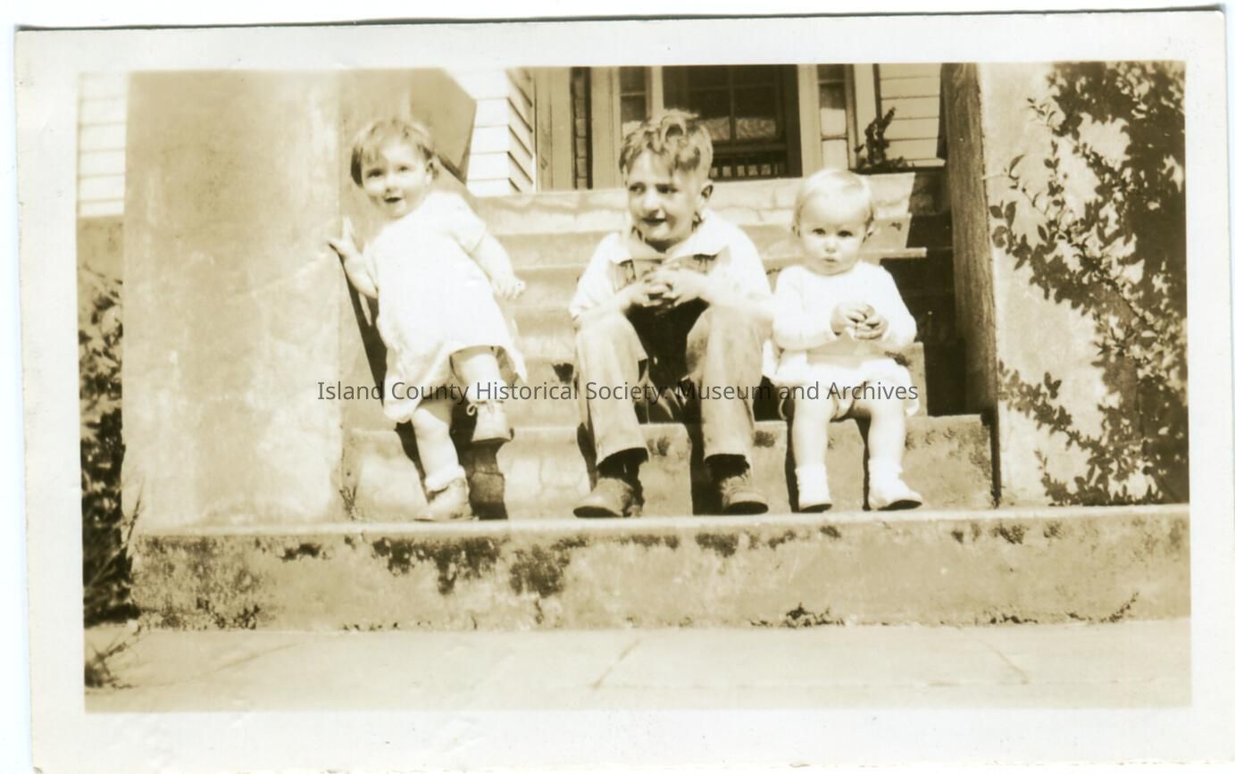 Photo of a young boy and two little girls sitting on concrete steps in front of a house or cabin; the girl on the left is wearing a dress; the boy is wearing overalls; the youngest girl is wearing a dress. On the back: