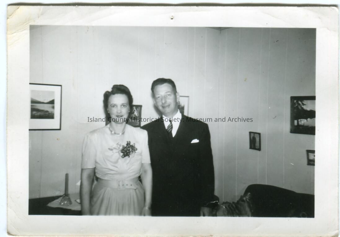 Photo of a man and woman in a room. She is wearing a dress, with a belt, and a corsage, he is wearing a siut with a kerchief in his pocket. On the back: "Ellen & Del Miller"