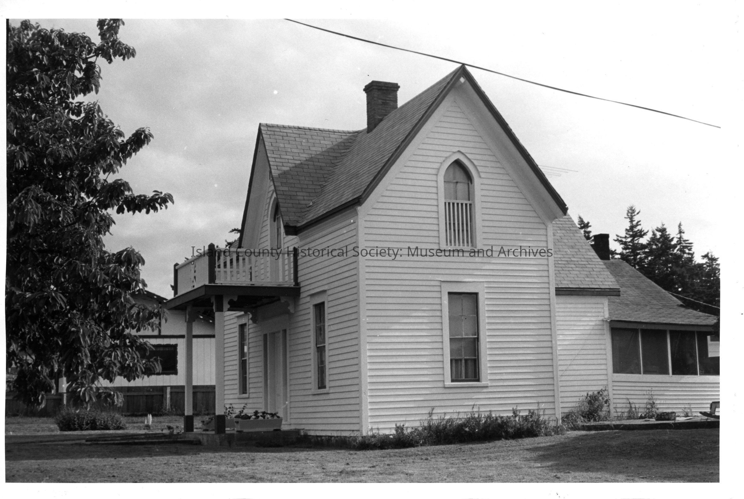 Libby House, built in 1870 by John Alexander Jr. and sold to Joseph B. Libbey. House stands at 308 N Main St., Coupeville. Gothic style, 1 1/2 stories with front door in center and porch above. Original decorative elements have been removed. View from north side shows additions to back.