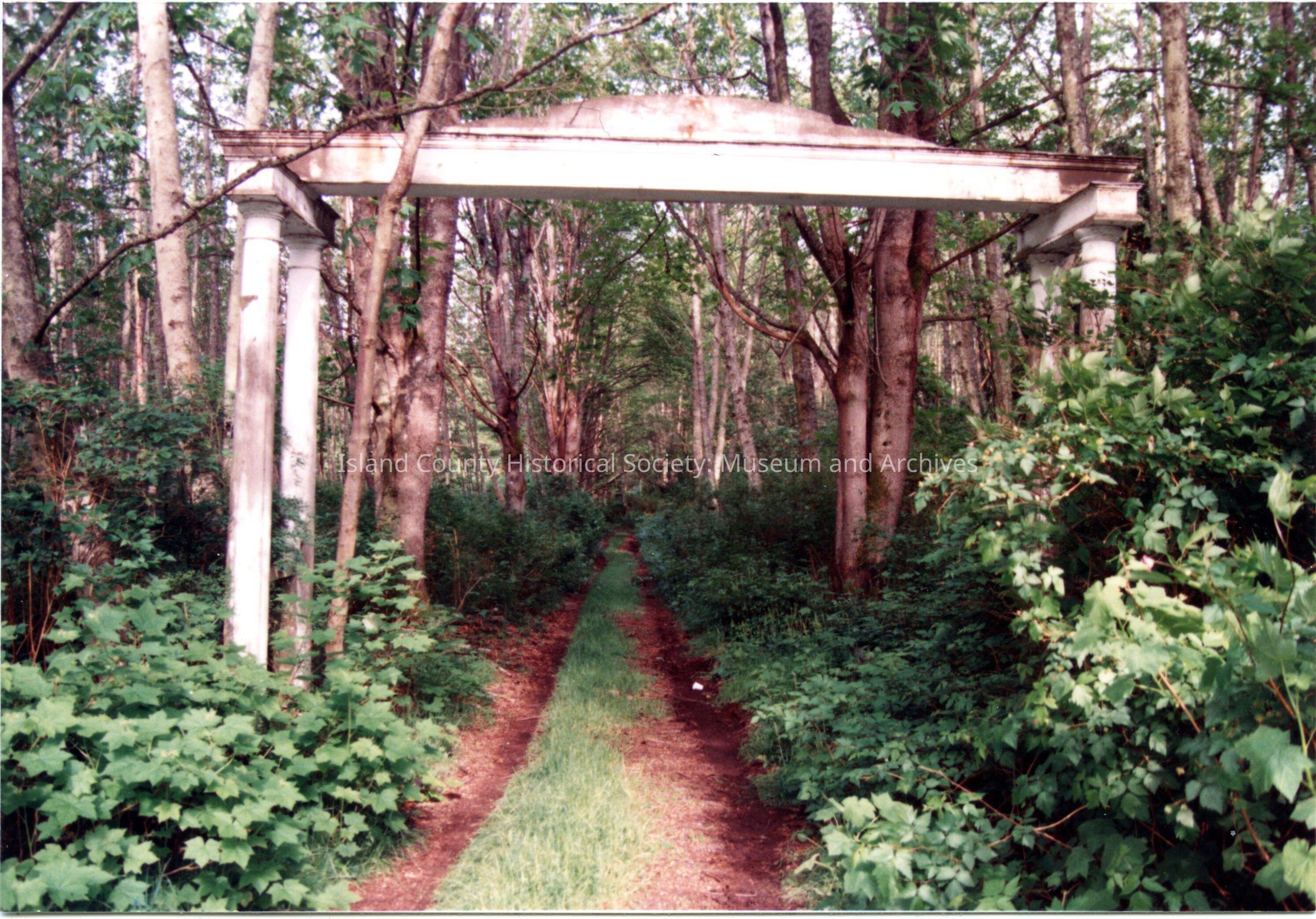 Photo of entrance pergola to Bonair Estates. Grass path leading under the pergola with trees, bushes on either side. Written on the back: To be the principal entrances to the Bonair Estates (50 years ago??) 1989.