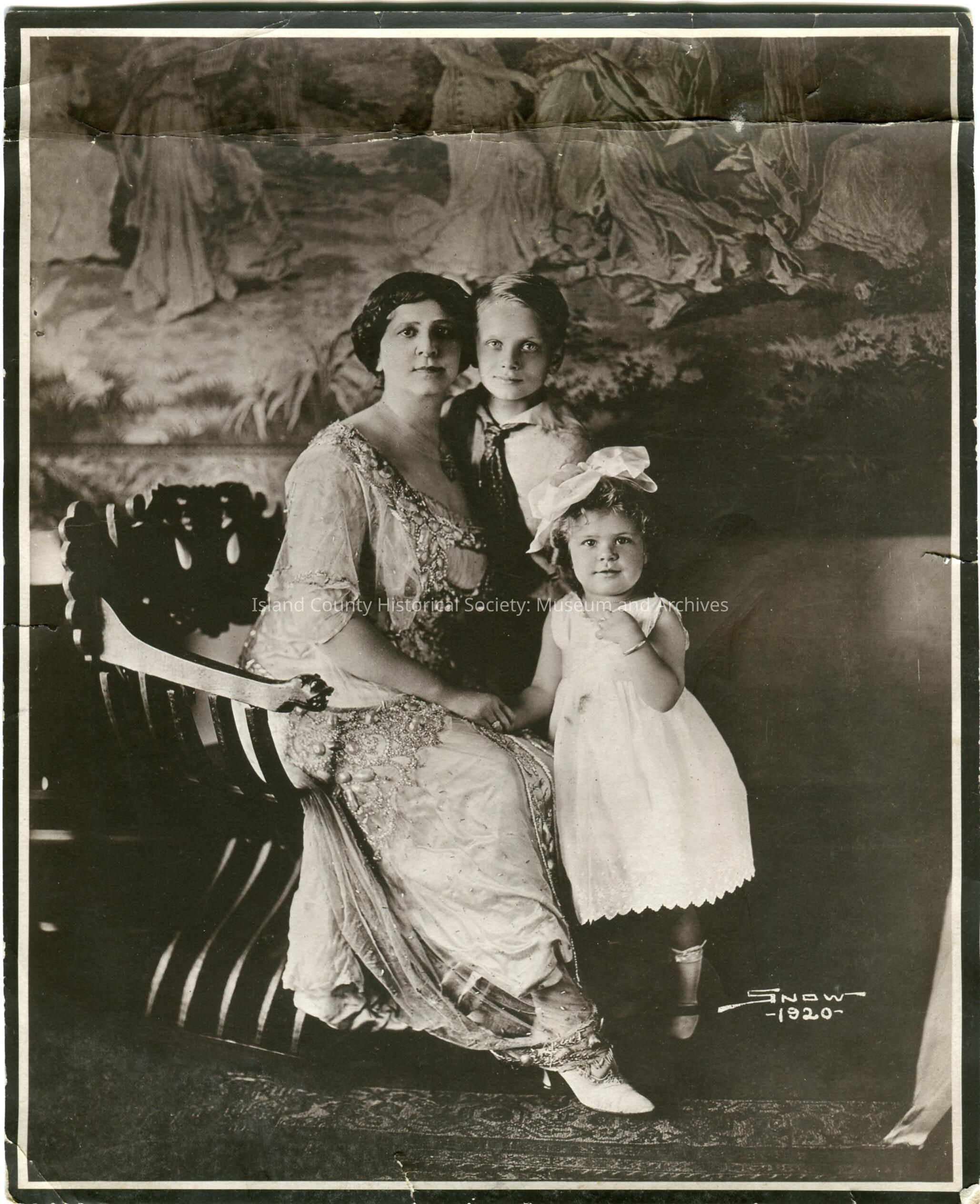 Photo portrait of a woman, girl and boy. The woman is sitting in a wooden armchair and wearing a beaded lace and perhaps satin dress with high heels. The boy is standing at her left shoulder and wearing a shirt and opened tie. The girl is wearing a dress with no sleeves, scallopped hem and has a bow in her hair; bracelet on her left arm, knee socks and shoes. She is standing in front of the woman. They are in front of a backdrop of ancient Roman or Greek women. On the floor is an floral rug. On the back: Anna Marie Philips and two children Albert and VirginiaMade/Created