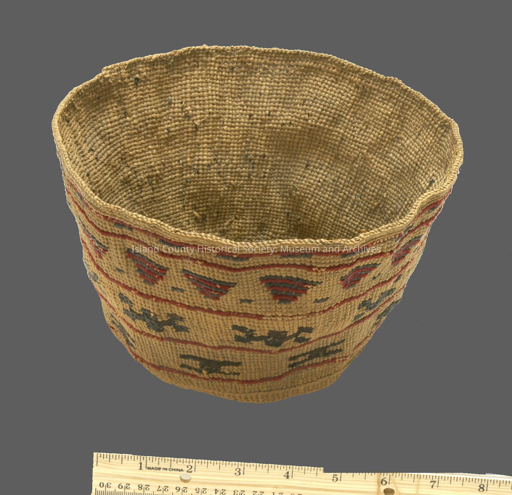 large light brown basket with red yarn and black grass design; Fraser River, CanadaCollection