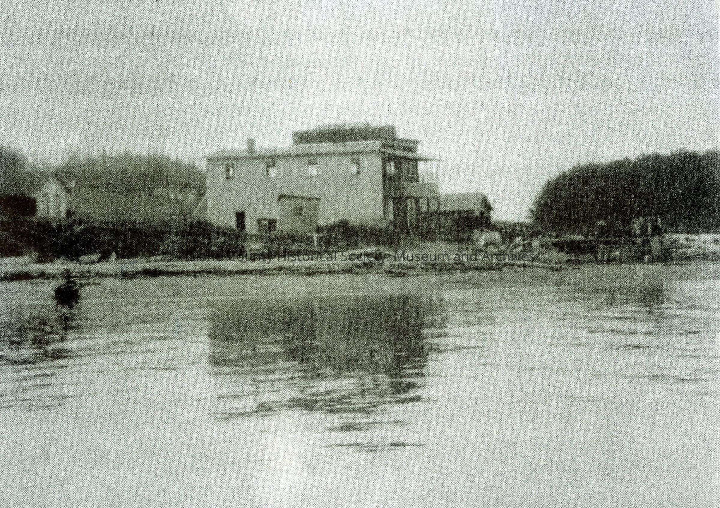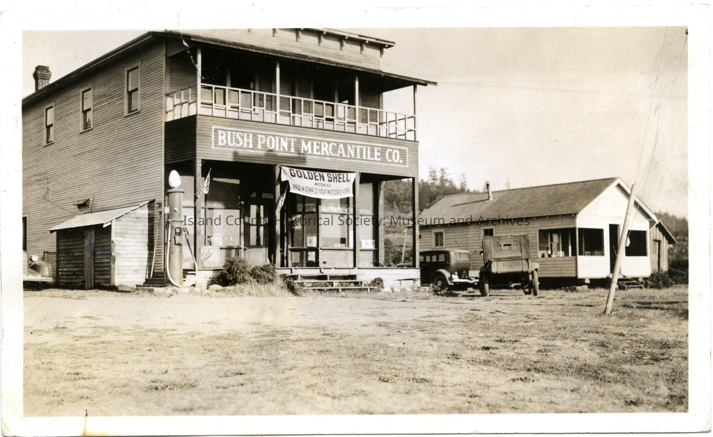 Postcard of the Bush Point Mercantile Co. store. It is a two story structure with a porch and balcony in the front. A banner is across the front of the lower porch, Golden Shell motor oil. A gasoline pump is on the left of the building in front of a shed attached to the store (from camera perspective); two cars (1920-style) are on the right. Another building is beyond the two cars. A pole is on the right - with wires to something beyond the photo.
