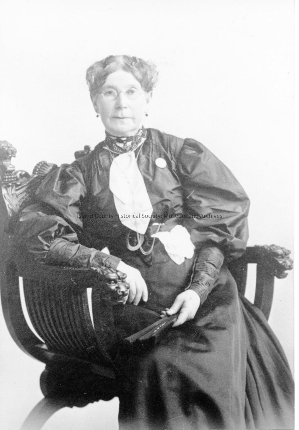 Portrait of Sarah M. Cook posed seated in a large dark dress with very poofy sleeves. (Leg-o-mutton sleeves)