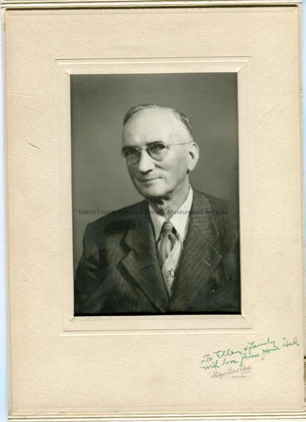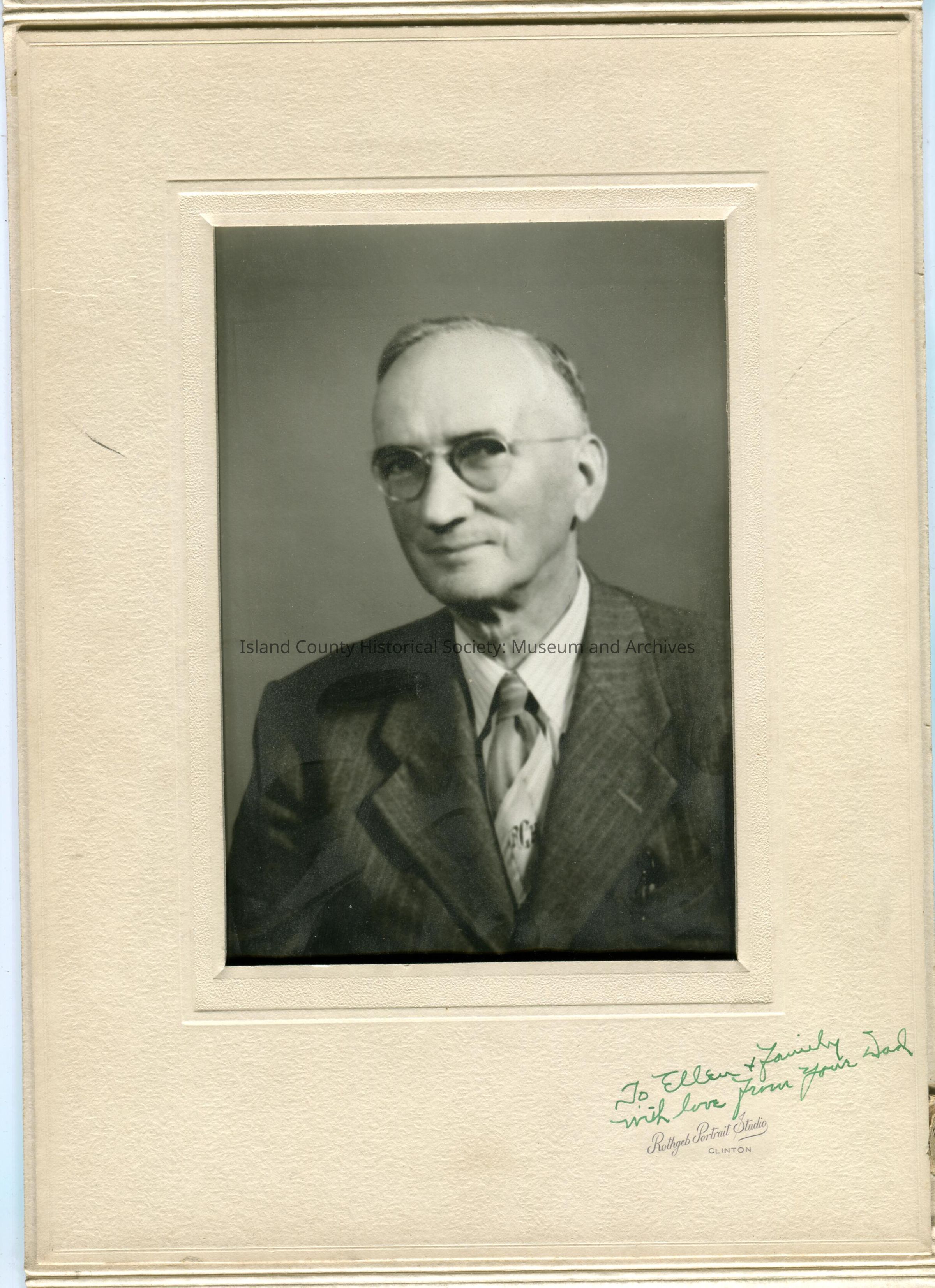 Photo portrait of an older man in a stroped suit, striped shirt and tie with a monogram. He is wearing wire rim glasses. On the folder frame is written in green ink: "To Ellen and family with love from your Dad". The photo is in a beige folder.
