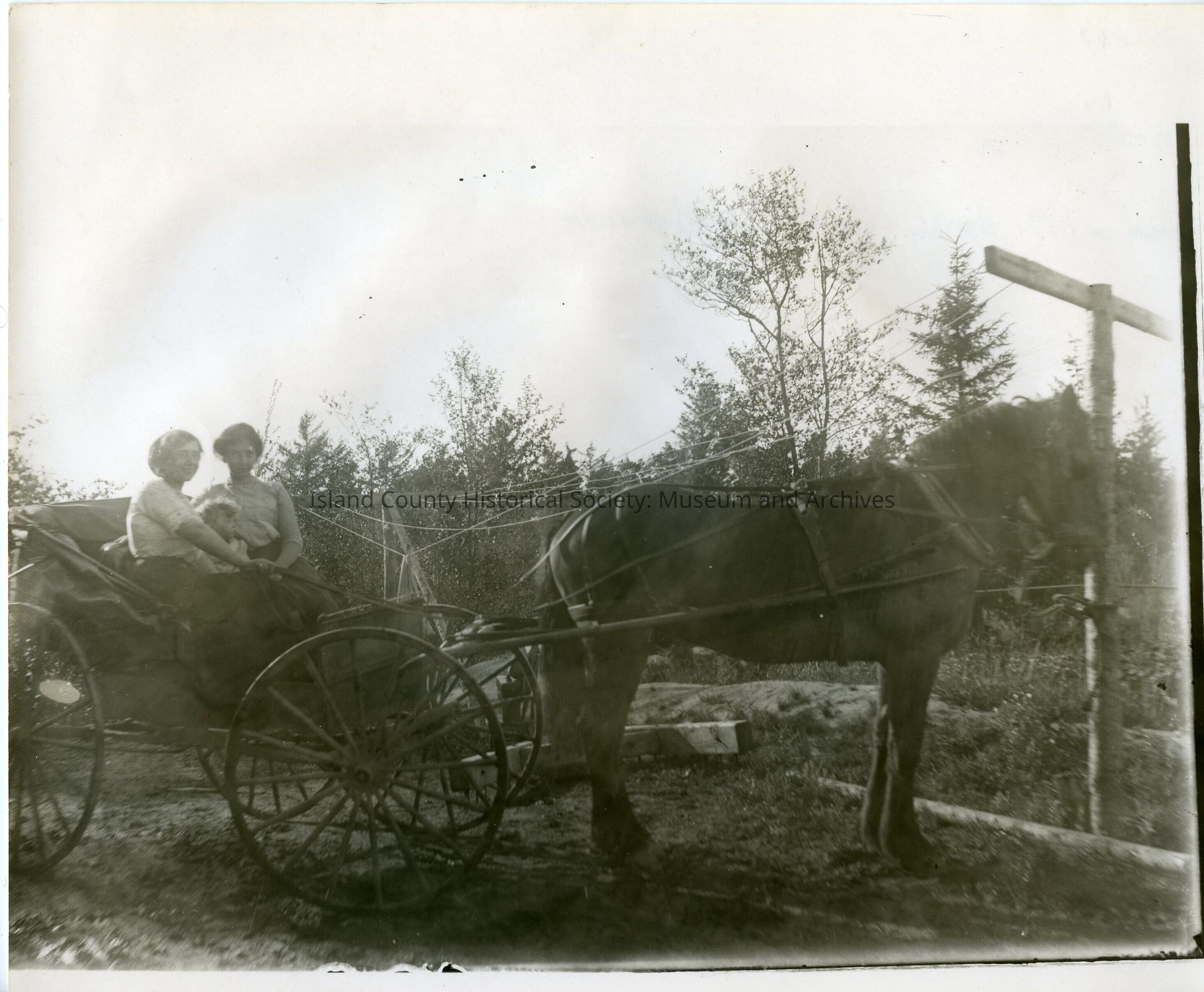 Black & white photo of two women with a toddler on top of a horse drawn buggy. They are in stopped in front of electric poles & wires with trees in the background. No date.