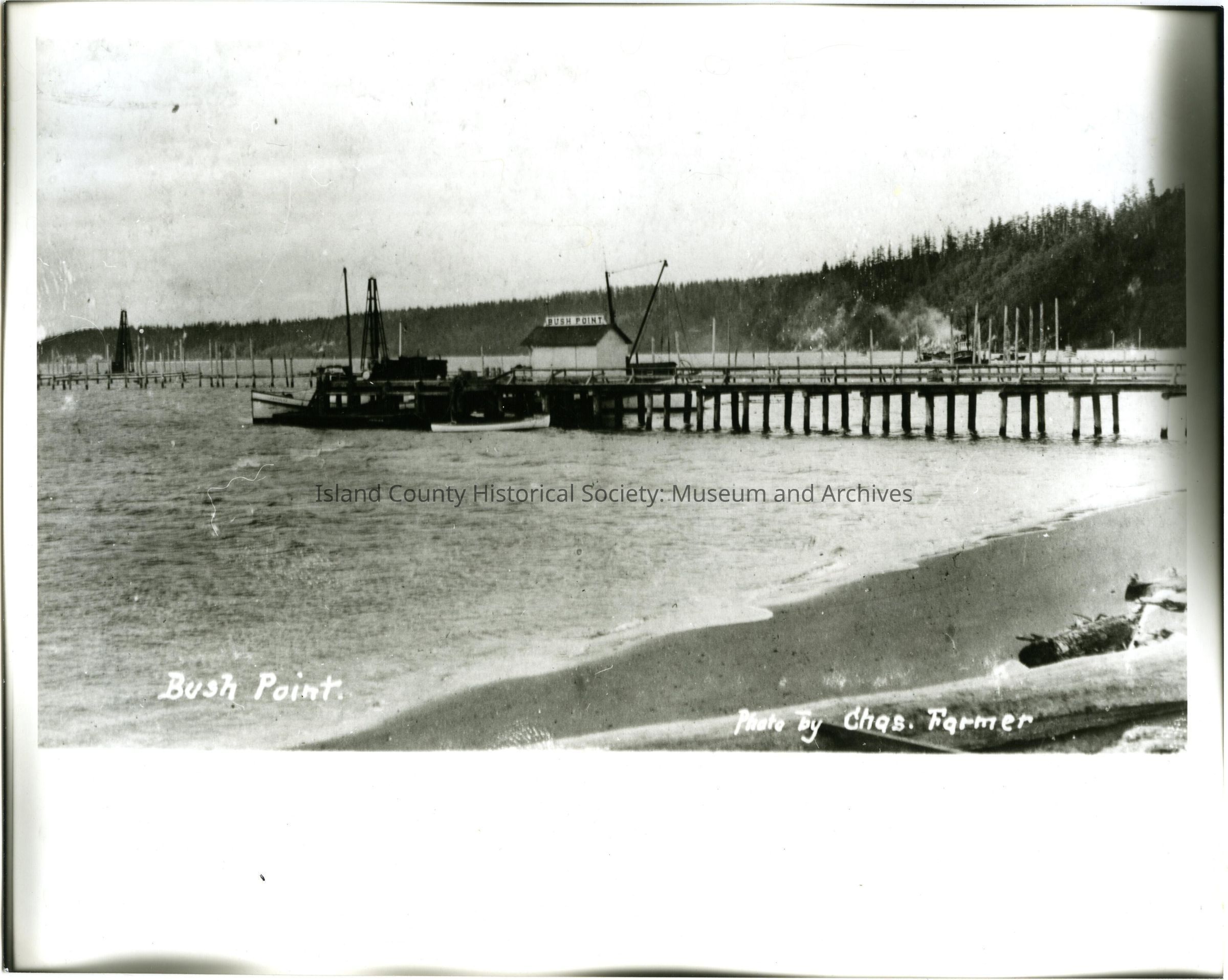 Photocopy of a photo of a dock looking from the land. Ladder-like structures are in the water as well as poles from an old pier or a fishing trap. A couple small boats are in the area. The small building on the wharf has a sign on the roof ridge: Bush Point. Driftwood on the beach.