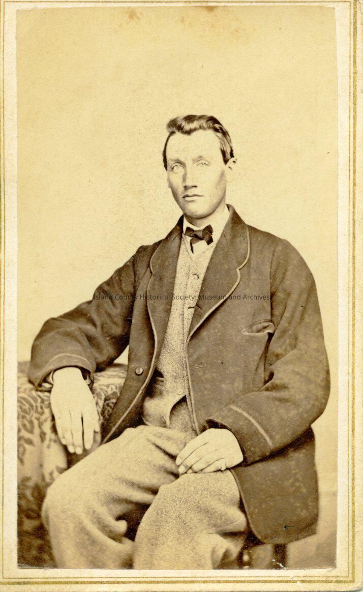 Portrait of an unidentified man wearing a suit and overcoat with a tie. He is seated but looks to be very tall.