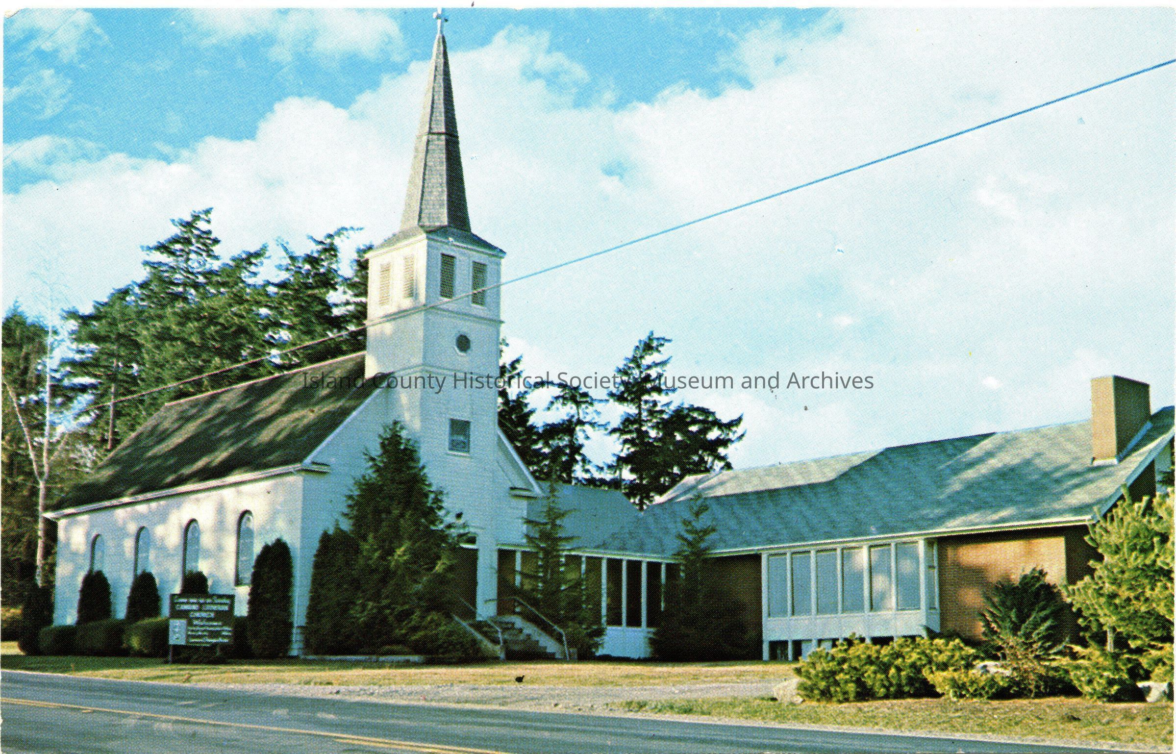Postcard of Camano Island Lutheran Church. It is a traditionally built church with central front door and stairs, with the steeple above the door. A large all-purpose room and connecting covered walkway are attached. On the back: Built in 1904, bell tower, and hand carved altar.