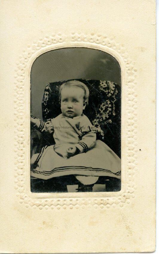 Unidentified baby, photo taken at 11 months old. The baby is wearing a dress and seated in a chair.