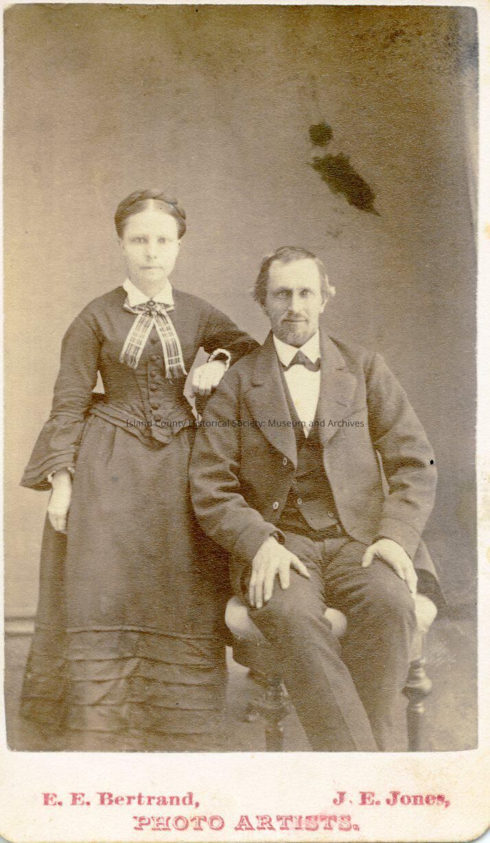 Unidentified couple, a woman standing in a dress with her arm resting on a man who is seated. The man is wearing a suit and overcoat.