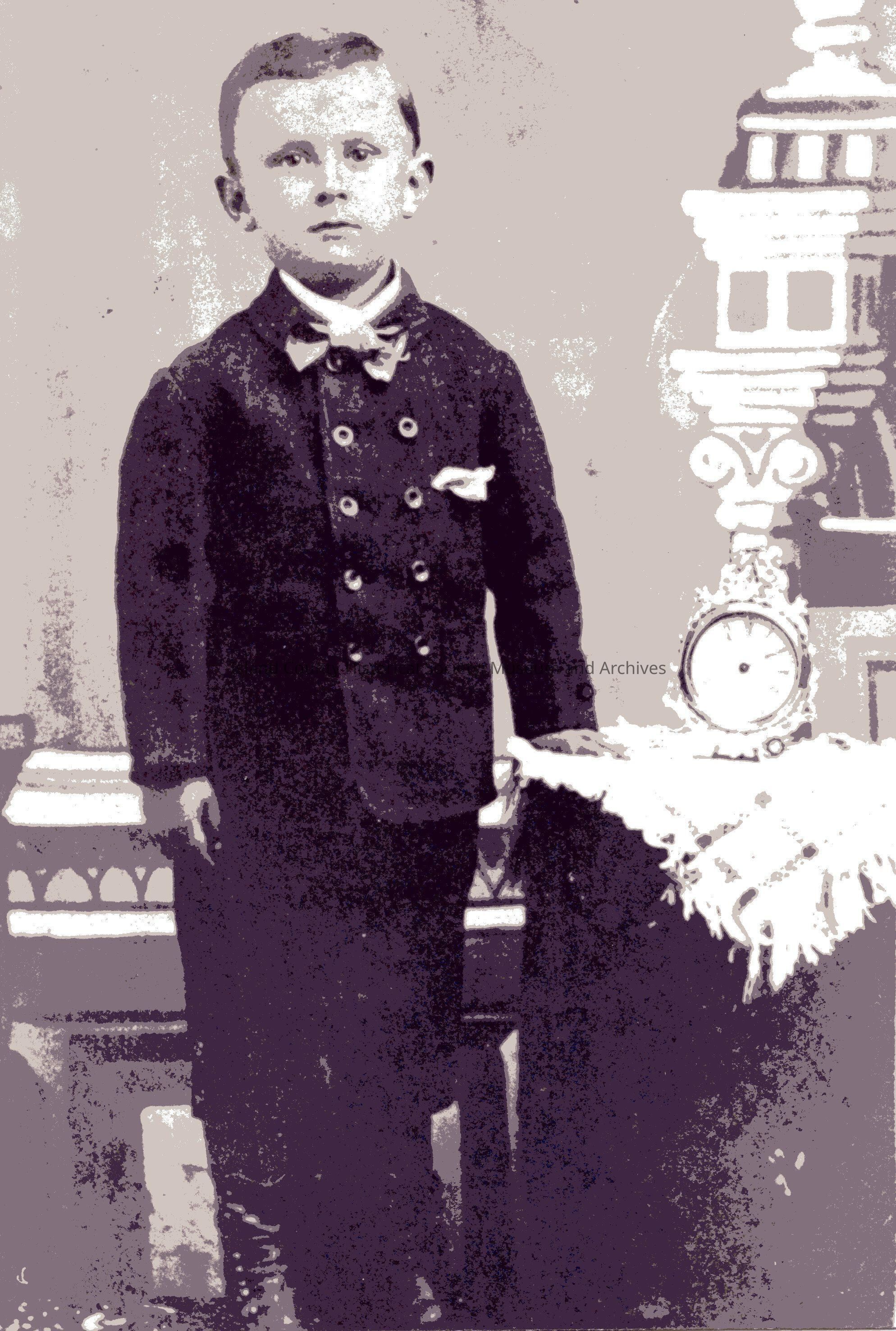 Howard Libbey at age 4. 5 September 1884. Formal portrait in suit and tie and boots standing with hand resting on table. A clock sits on table.