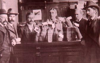 Photograph of men gathered around a sales counter. Small canvas sacks with paper tags sit on the counter. Likely c. early 1900s.