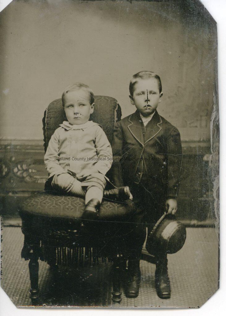 Portrait of two boys one sitting on a chair the other is standing next to him holding his bowler hat.