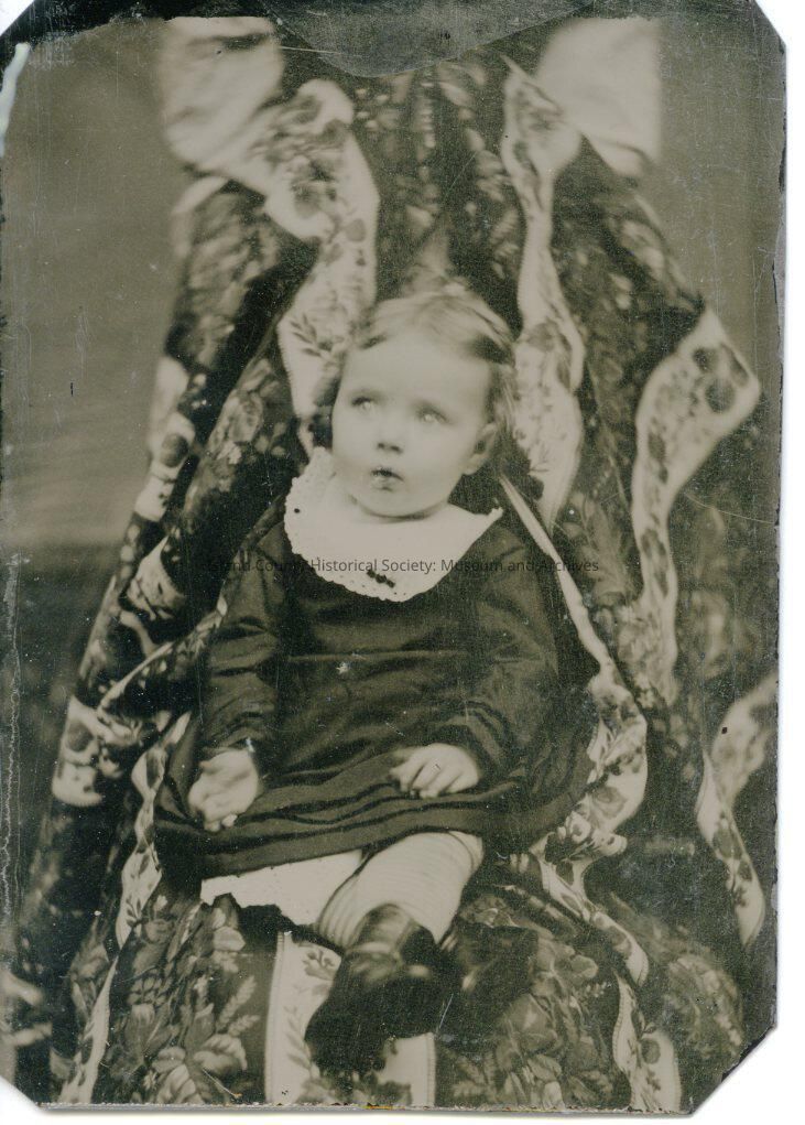 Portrait of an unidentified young girl. She is wearing a dress and boots and is seated in a chair.
