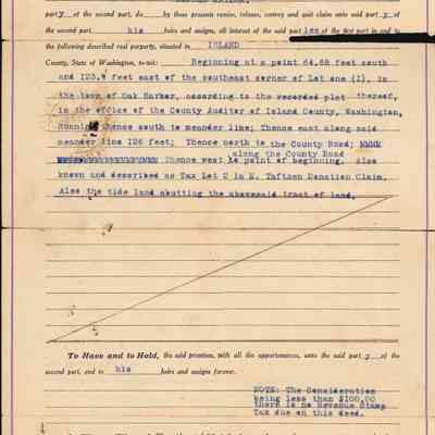 "Beginning at a point 64.68 feet south and 123.9 feet east of the southeast corner of Lot one (I), in the town of Oak Harbor, according to the recorded plat thereof, int he office of the County Auditor of Island County, Washington, Running thence south to meander line; Thence east along said meander line 126 feet; Thence north to the County Road, Thence west along the County Road. Also known and described as Tax Lot 2 in M. Taftzen Donation Claim. Also the tide land abutting the above said tract of land."Collection