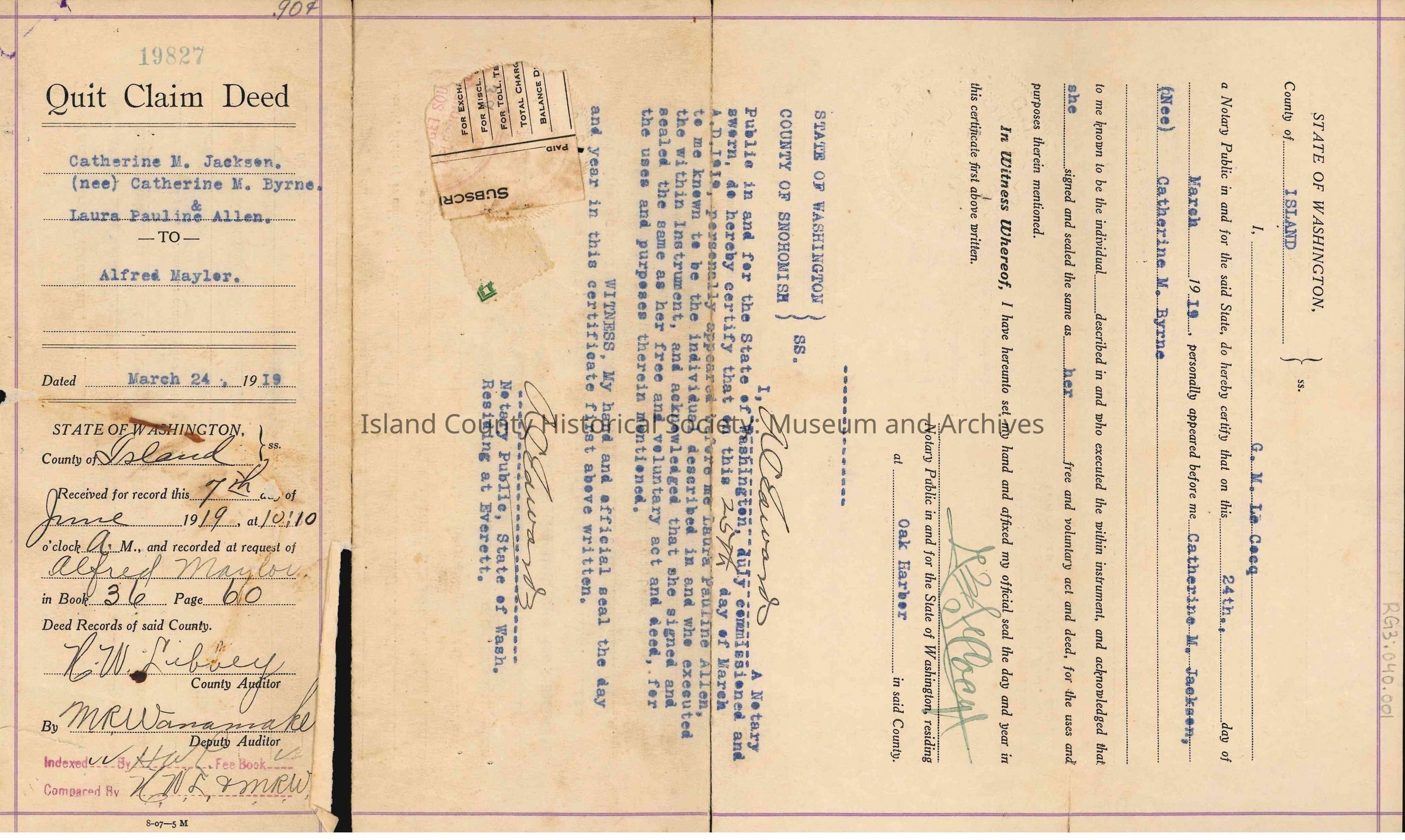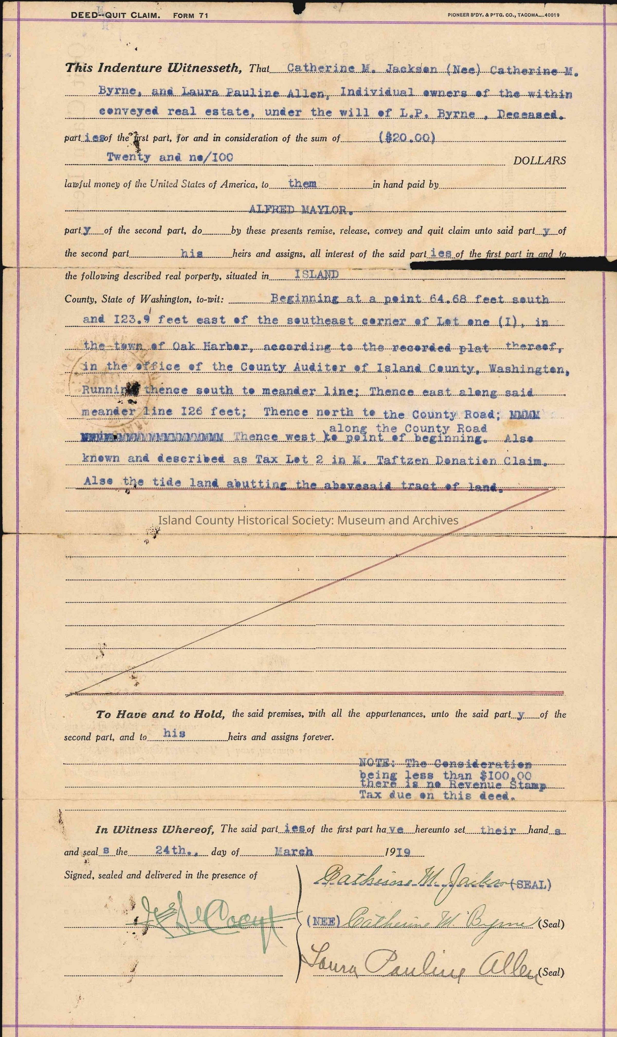 Quit Claim Deed from Catherine M. Jackson (nee Catherine M. Byrne) and Laura Pauline Allen to Alfred Maylor, c. 19 June, 1919. This Quit Claim Deed is for the consideration of $20.00 (twenty) U.S. dollars and for the following portions of land in Island County: