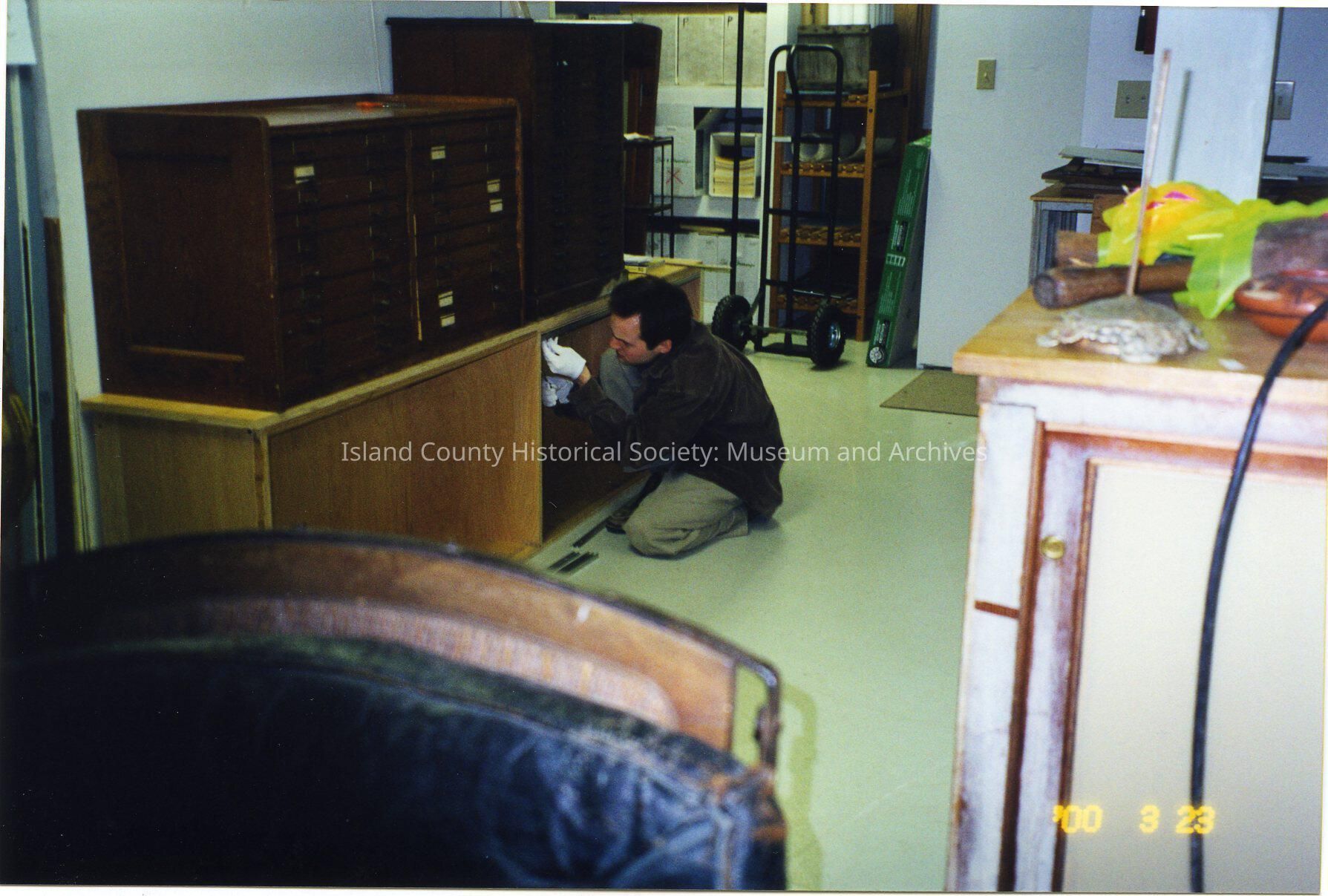 Island County Historical Society basement. Man kneeling and working on cabinet. multiple pieces of cabinets inphotograph, hand truck, and miscellaneous items located through out photograph. Name "Jim" is written on back.