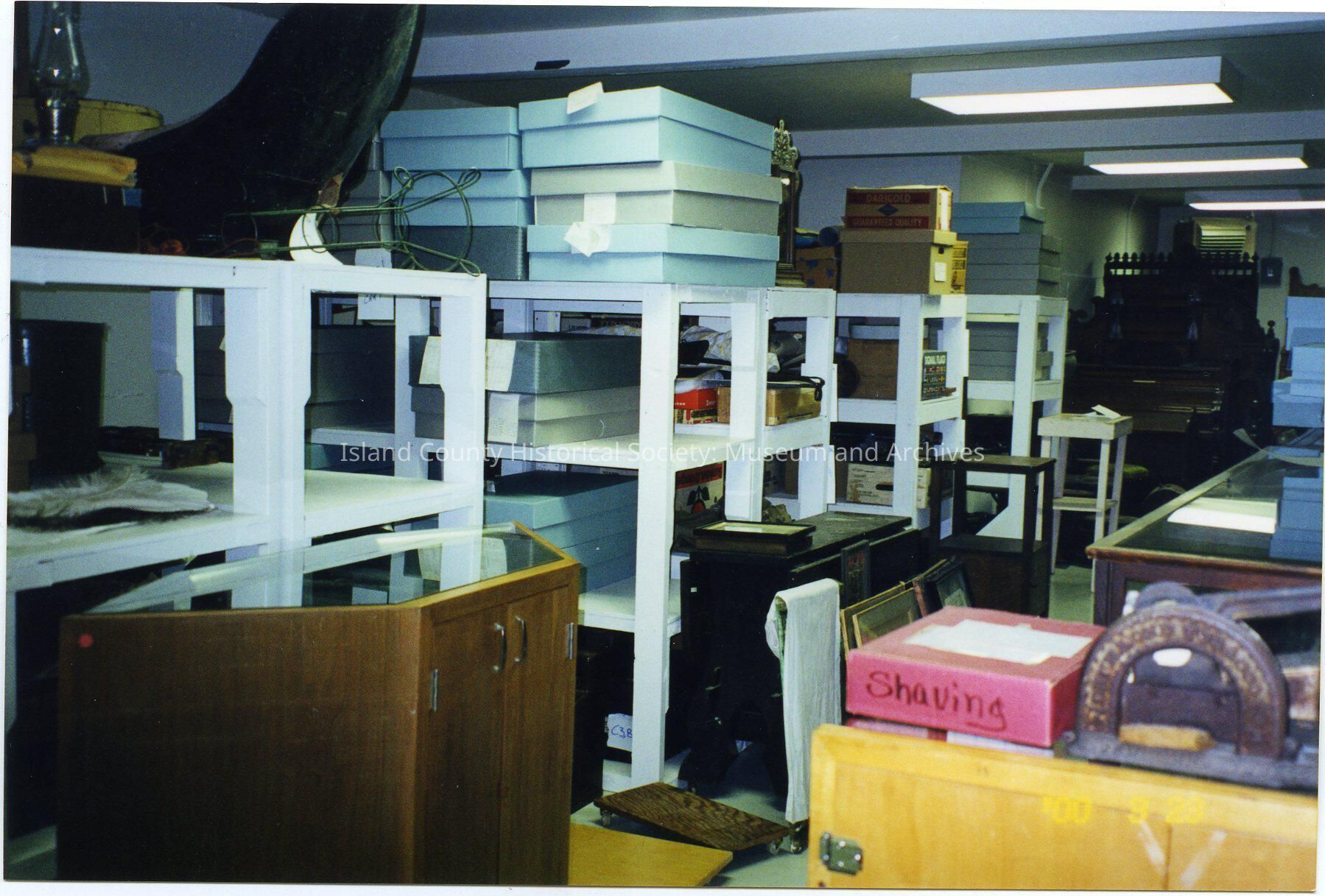 Island County Historical Society basement. Contains white shelving, various boxes, miscellaneous materials. Date on photograph is " '00 3 23."