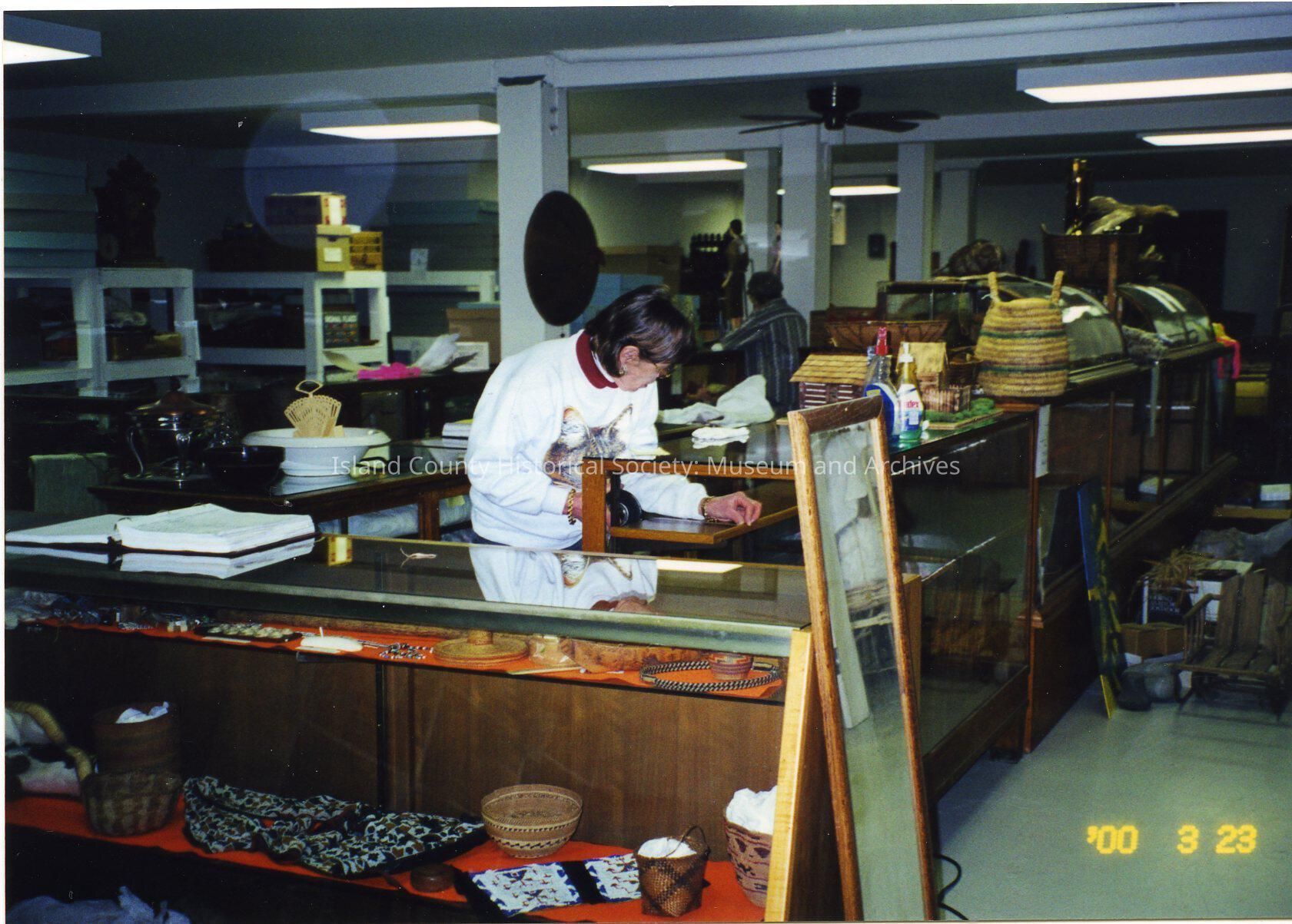 Island County Historical Society basement. Various display cases containing baskets, various museum artifacacts. Joan Handy (identified by Rick Castellano) working in one case. Date on photograph is " '00 3 23."