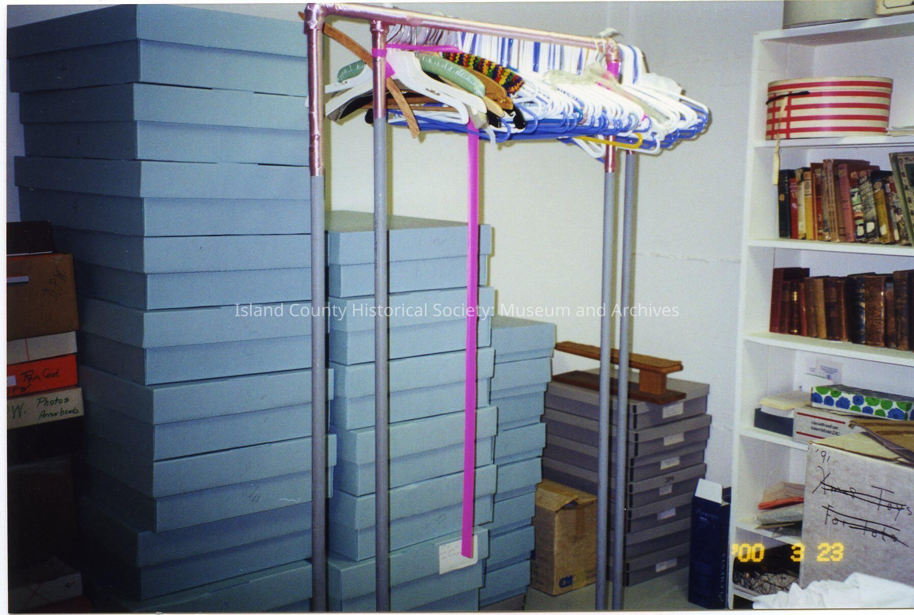 Island County Historical Society basement. Blue boxes, coat hangers, clothes hangers, library shelves, and books.