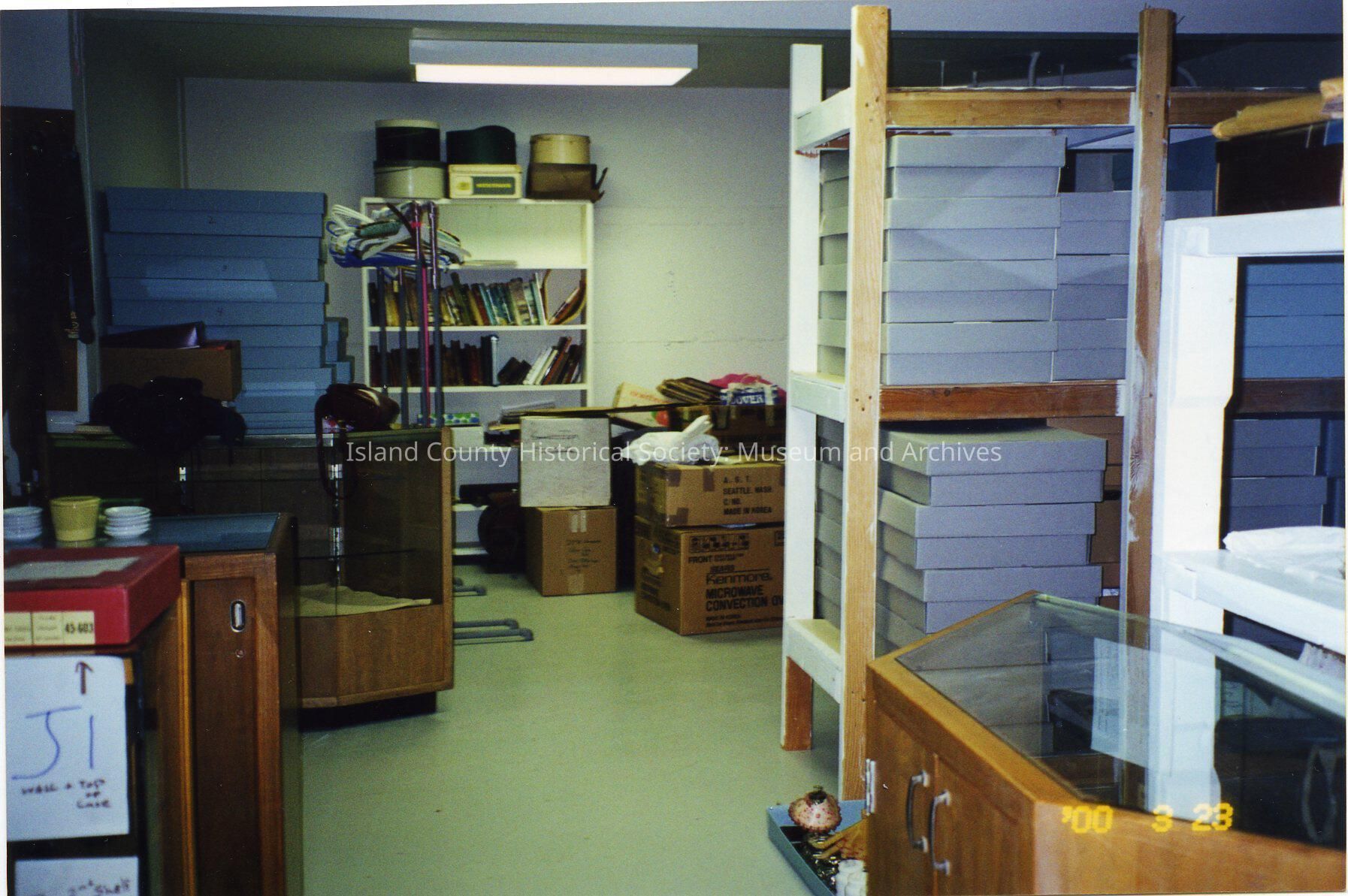 Island County Historical Society basement. Blue boxes, books, book shelves, shelves. Date on photograph is " '00 3 23."