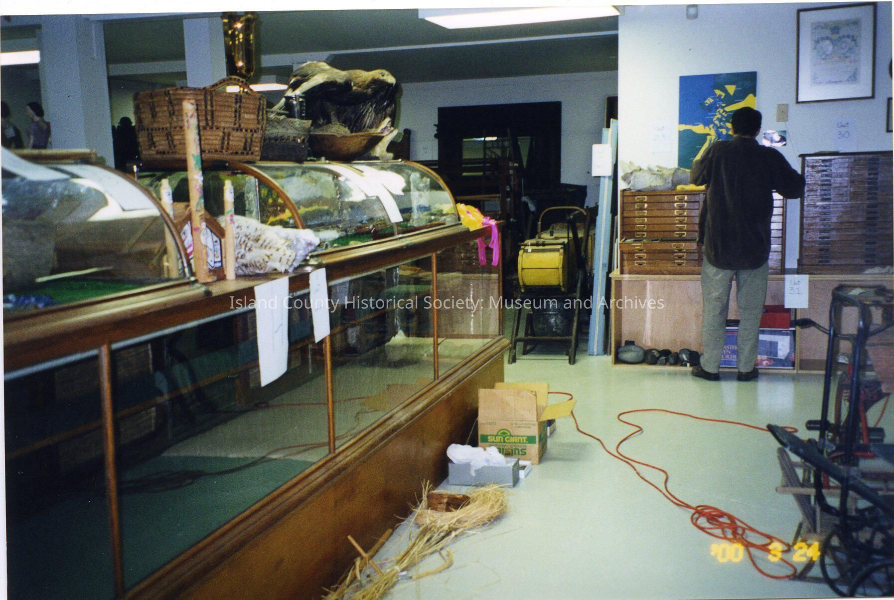 Island County Historical Society basement. Back of a man, glass display cases, miscellaneous cords, equipment, and cabinets.