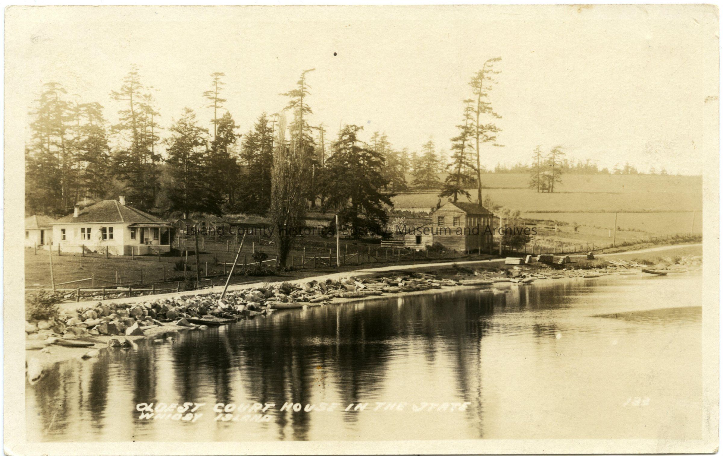 Postcard of the old courthouse in Coveland/San de Fuca. Split rail fence, trees, and a house on the left. Drifwood on the beach, trees to the left, cleared area beyond the court house. On the lower right of the postcard: 133