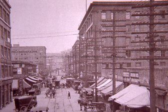Photograph of Western Avenue in Seattle, looking North from the Marion Street viaduct. Likely c. late 1800s. In the left front is the Maritime Building.