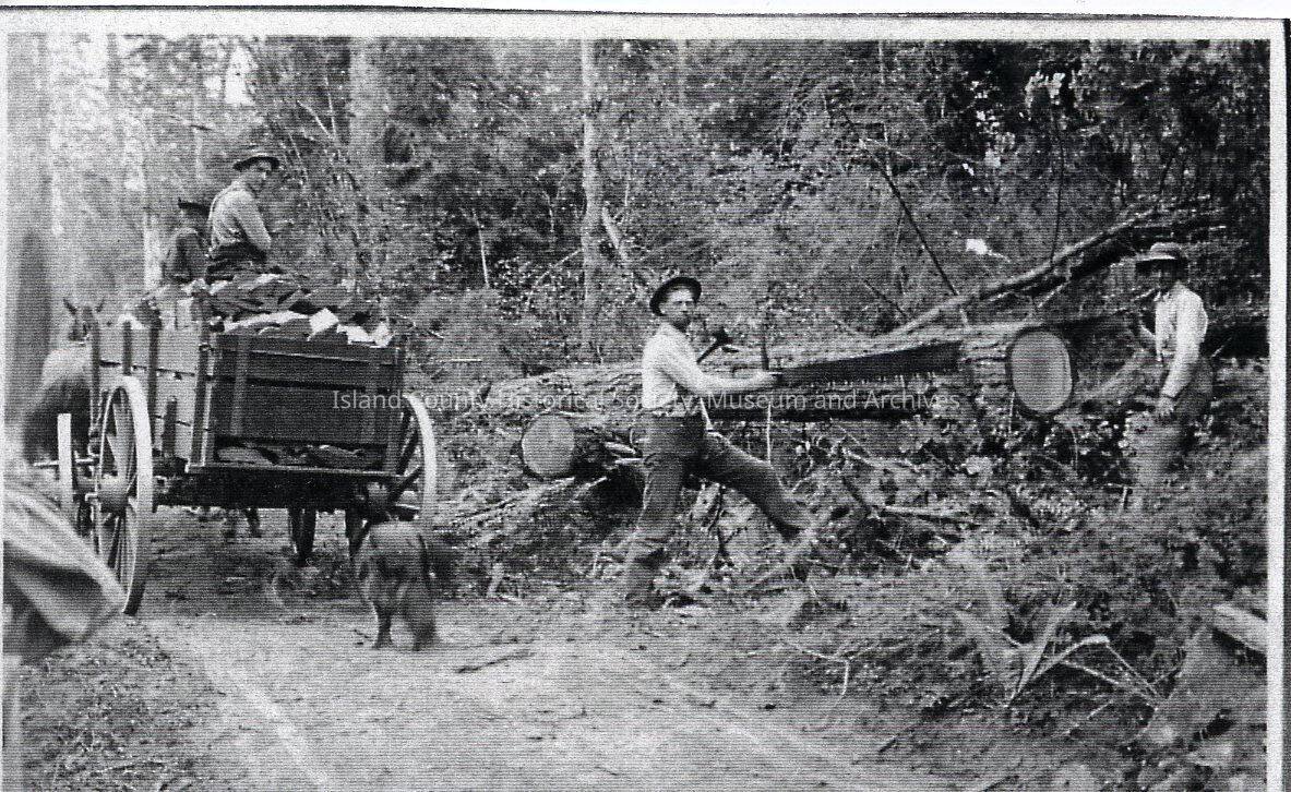 Black & white photo of Harry Grasser sawing a large tree with another logger using a crossaw. There is a horse-drawn open wagon on a dirt road next to Harry filled with cut wood. Two men are in the wagon and a dog is following it.