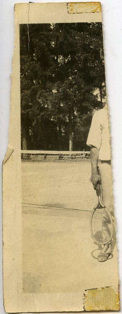 Right 2/3 of photo is missing. The left side of the photo is a portion of a man holding a tennis racket. He is standing on a tennis court in front of the net. His face is torn away. No description or date.