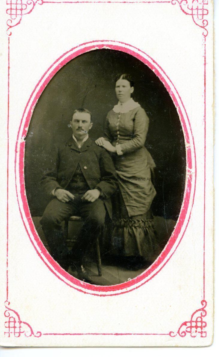 Portrait of an unidentified couple, man is seated wearing a suit, the woman is standing with her hands rested on the man's shoulder, she is wearing a dress.