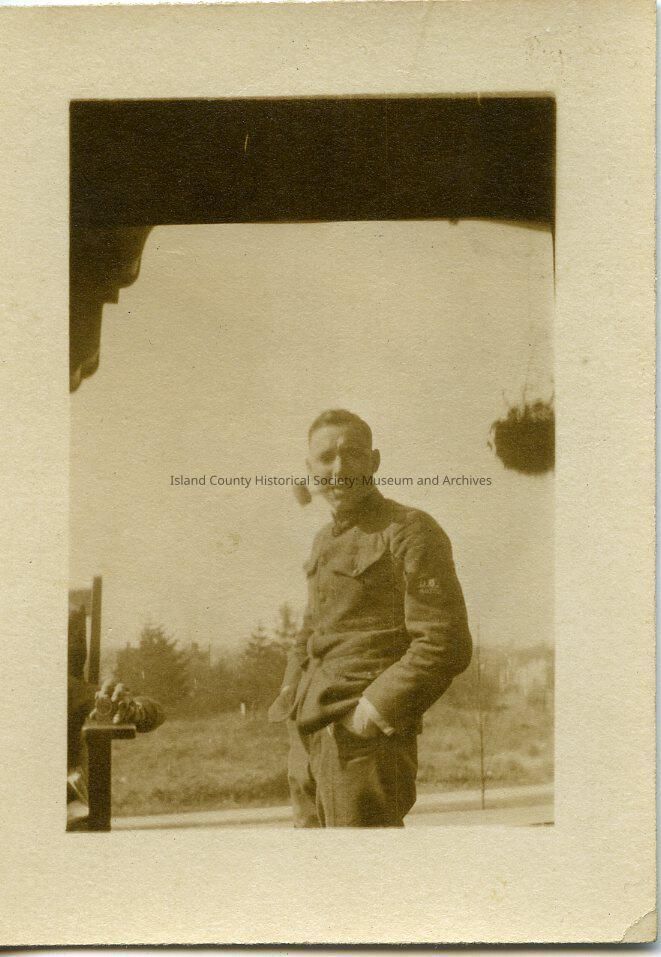 Photo of a man in uniform smoking a pipe. He appears to be standing on a porch. No description or date.