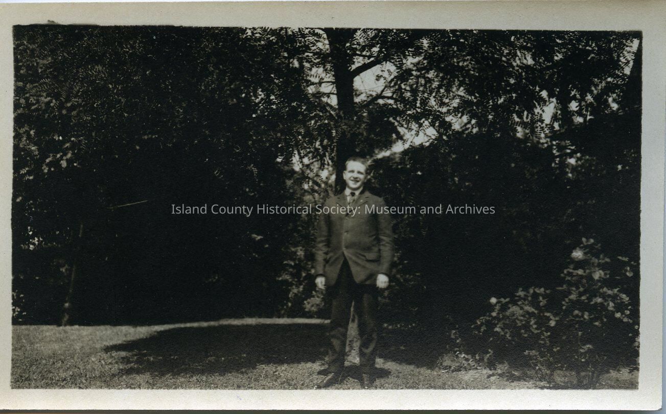 Photo of a man in a suit and tie standing in a garden/yard. No description or date.