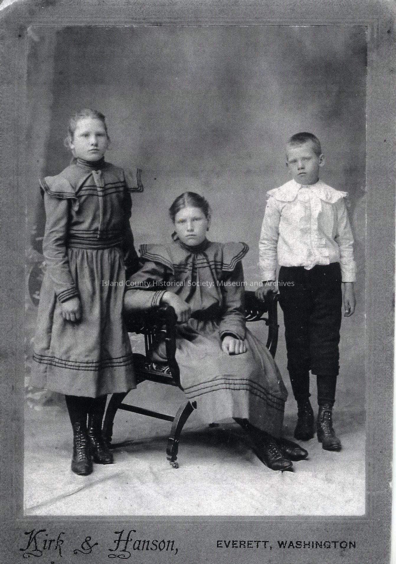 Black & white portrait photocopy of the Grasser children. From left to right: Anna, Dora, and Harry Grasser. The girls have their hair pulled back and are wearing identical dresses with long sleeves, high collars, and ribbon trim on the sleeves, bodice, and hem. Harry is wearing knickers and a white frilly shirt. None of the children are smiling in the photo. No date.