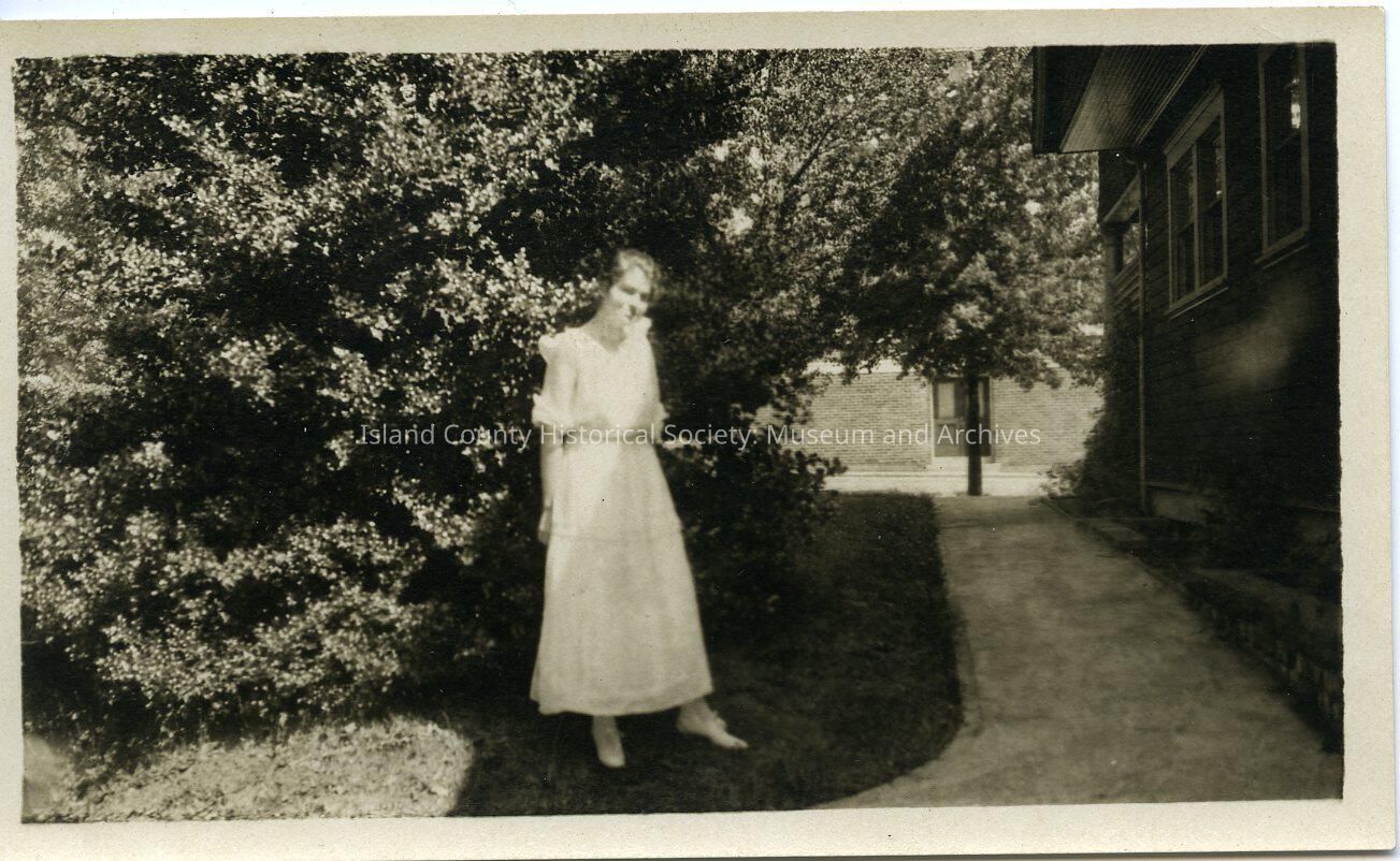 Photo of a young woman in a long, light colored dress and ankle-high shoes. She is standing on the side of a house in front of a large shrub. No description or date.