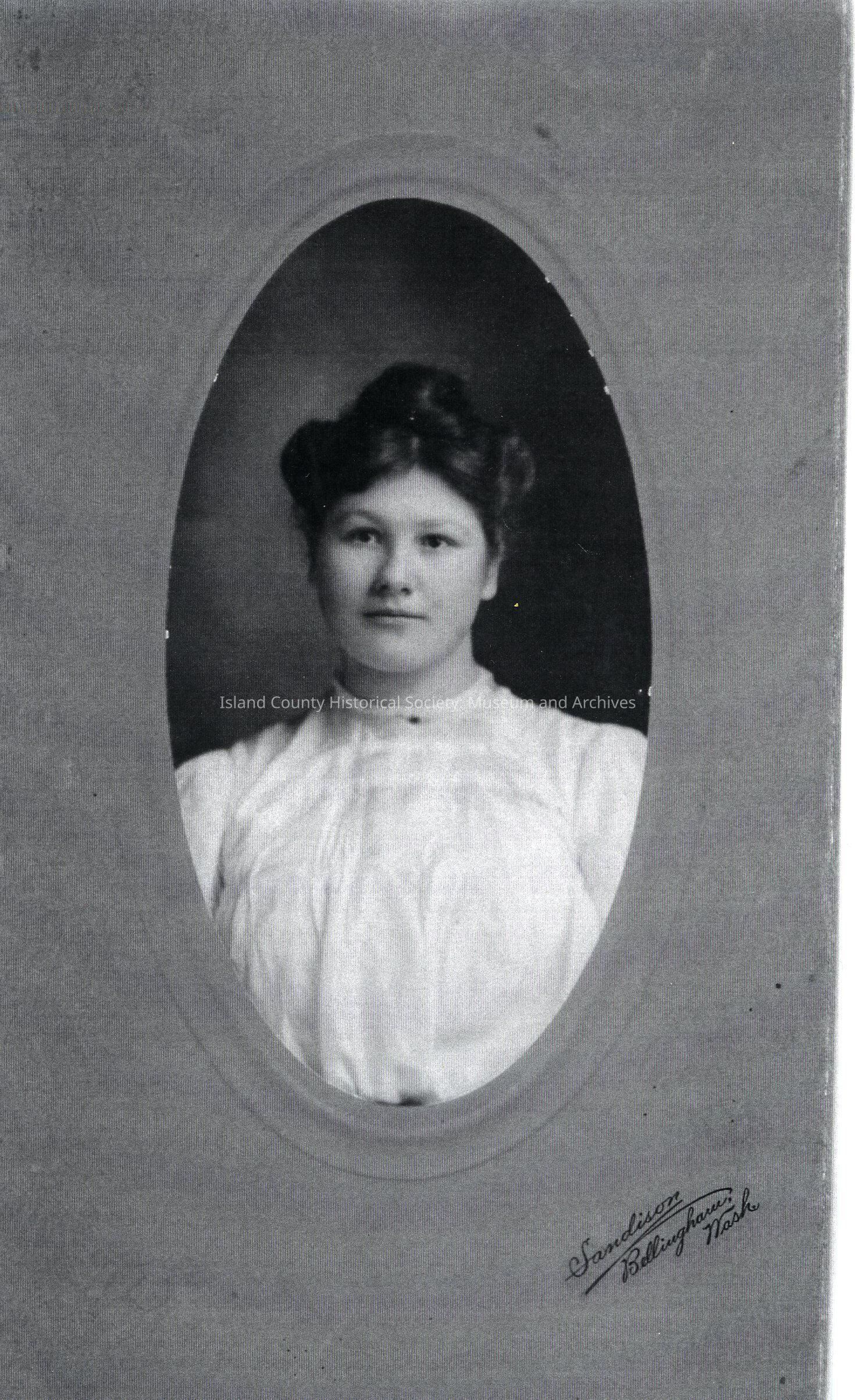 Black & white portrait photocopy of Anna Grasser Morris as a young woman. The original oval picture was in a rectangular frame. Anna's dark hair is swept up on her head and she is wearing a white blouse. Written on the back is 1907.